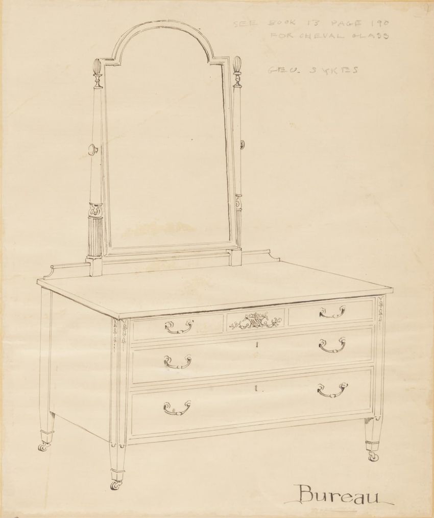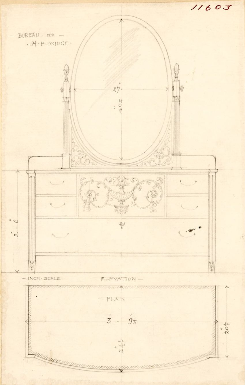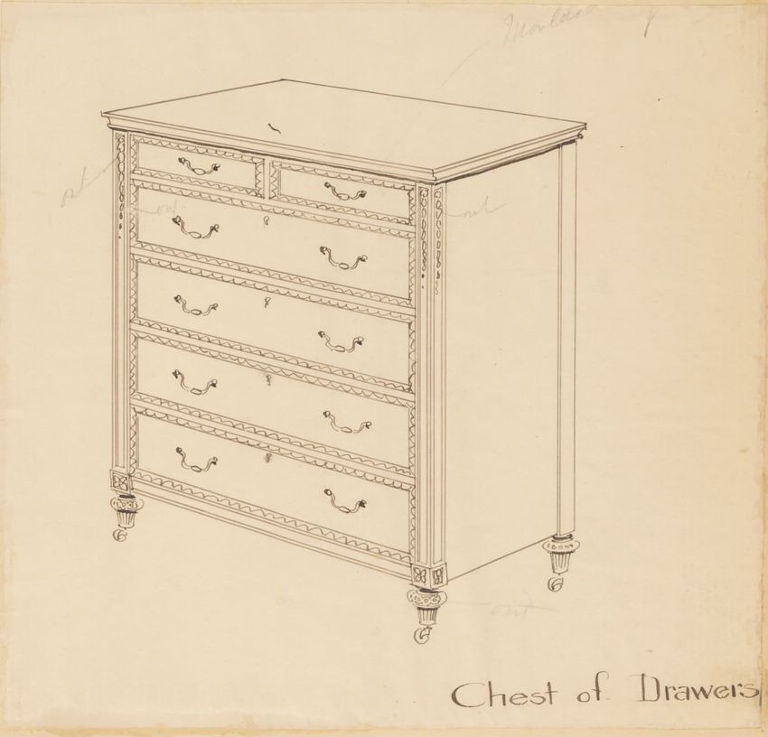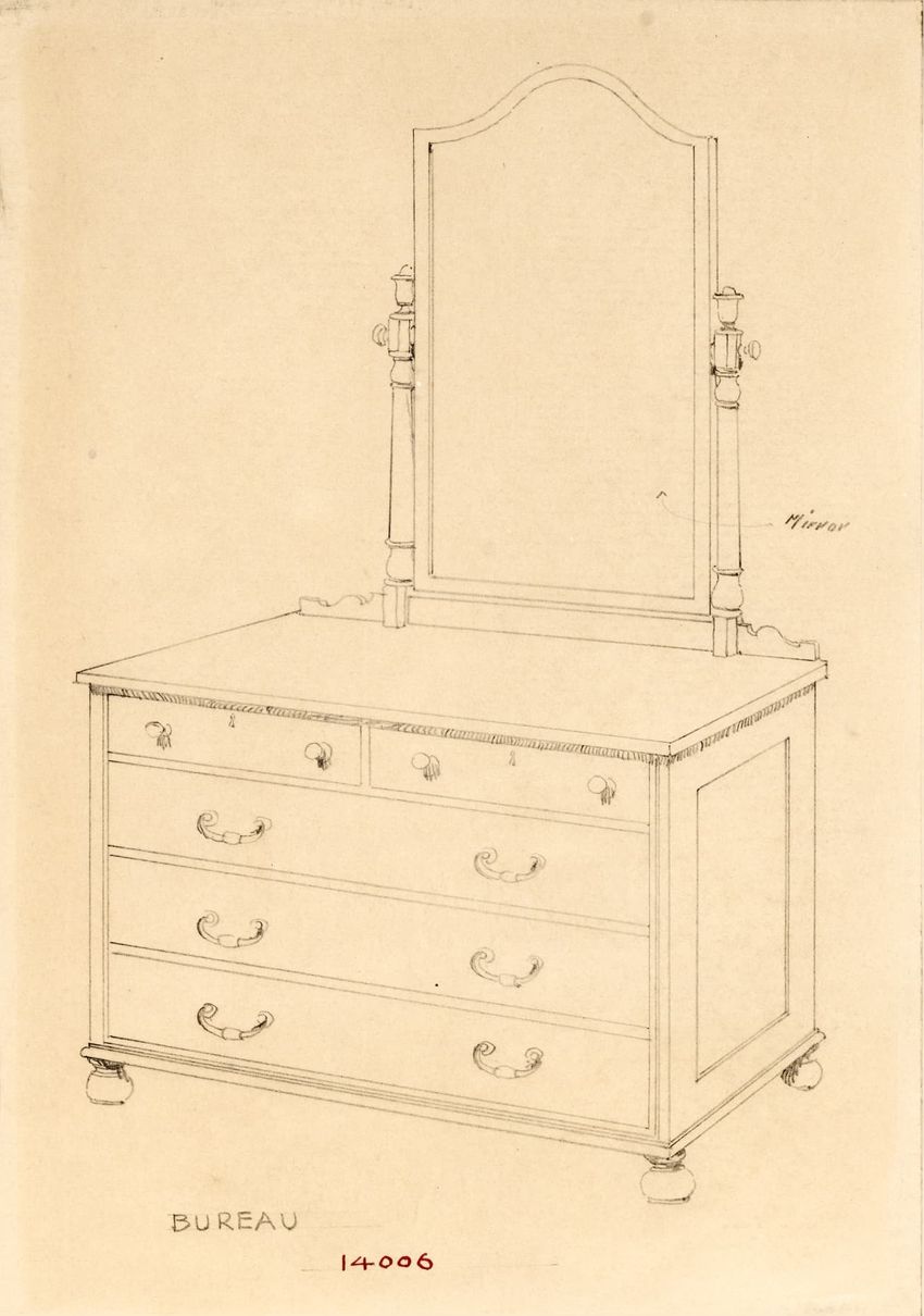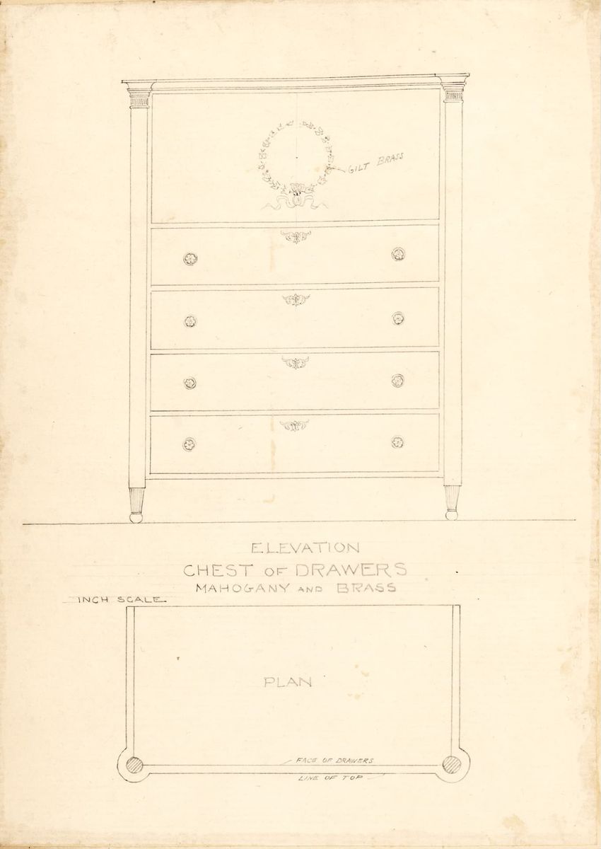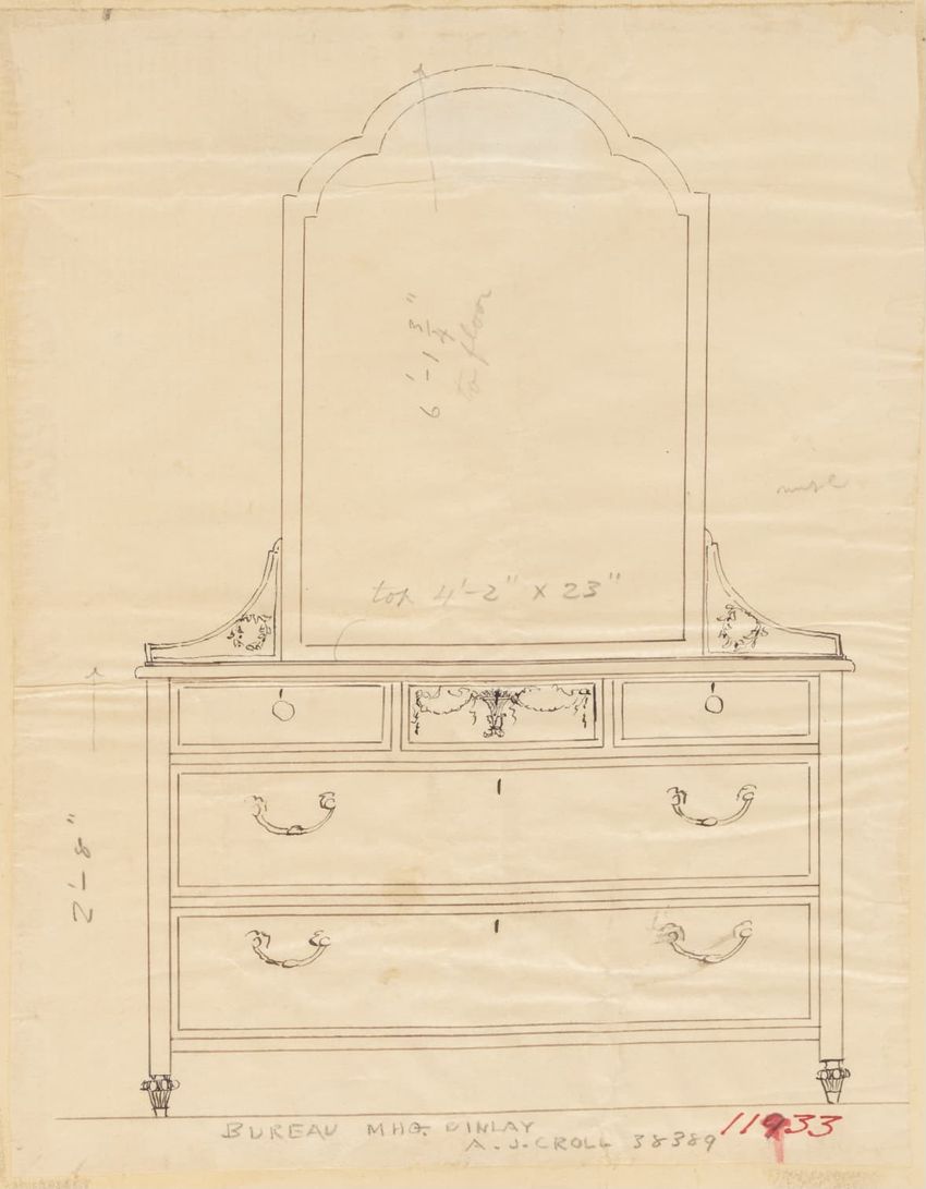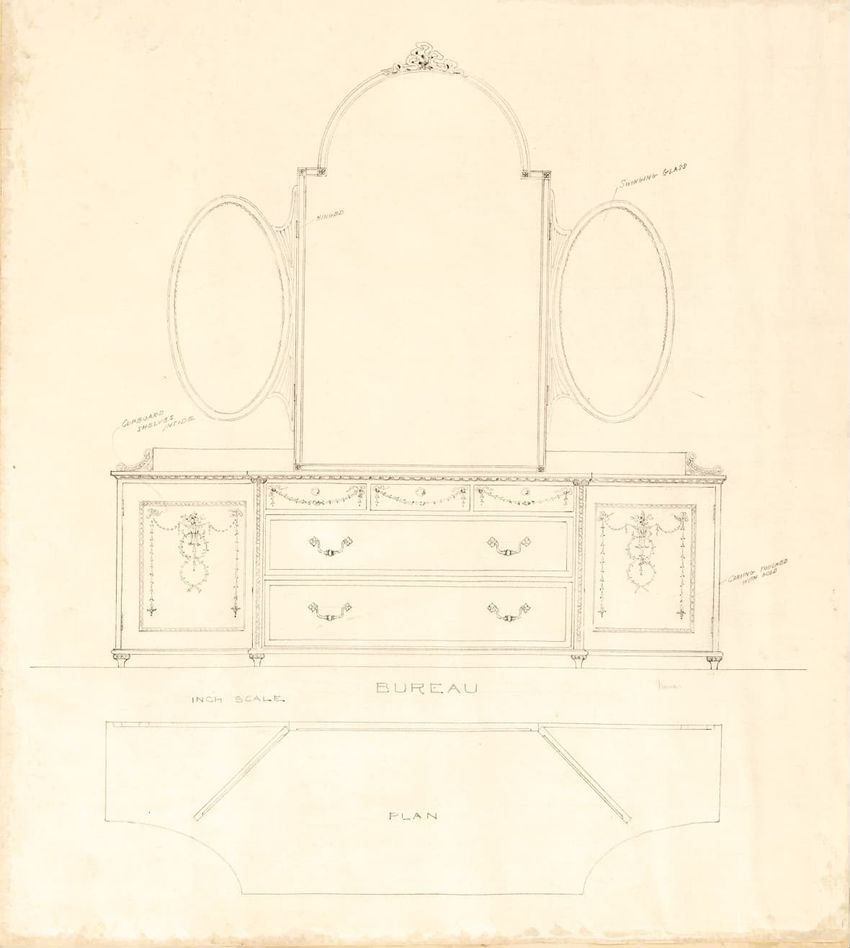 Untitled design drawing rendered in pencil on trace. Front and side views are shown. Rectangular bureau has overhanging top; four drawers with bail handles in a two-over-two arrangement; straight skirt; square stiles with carved, painted or inlaid trefoil motif and stringing; and tapered cylindrical...