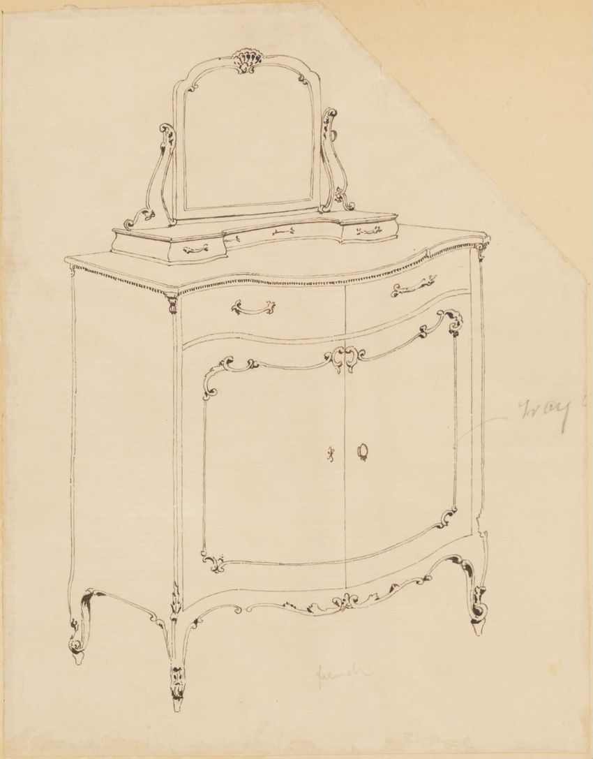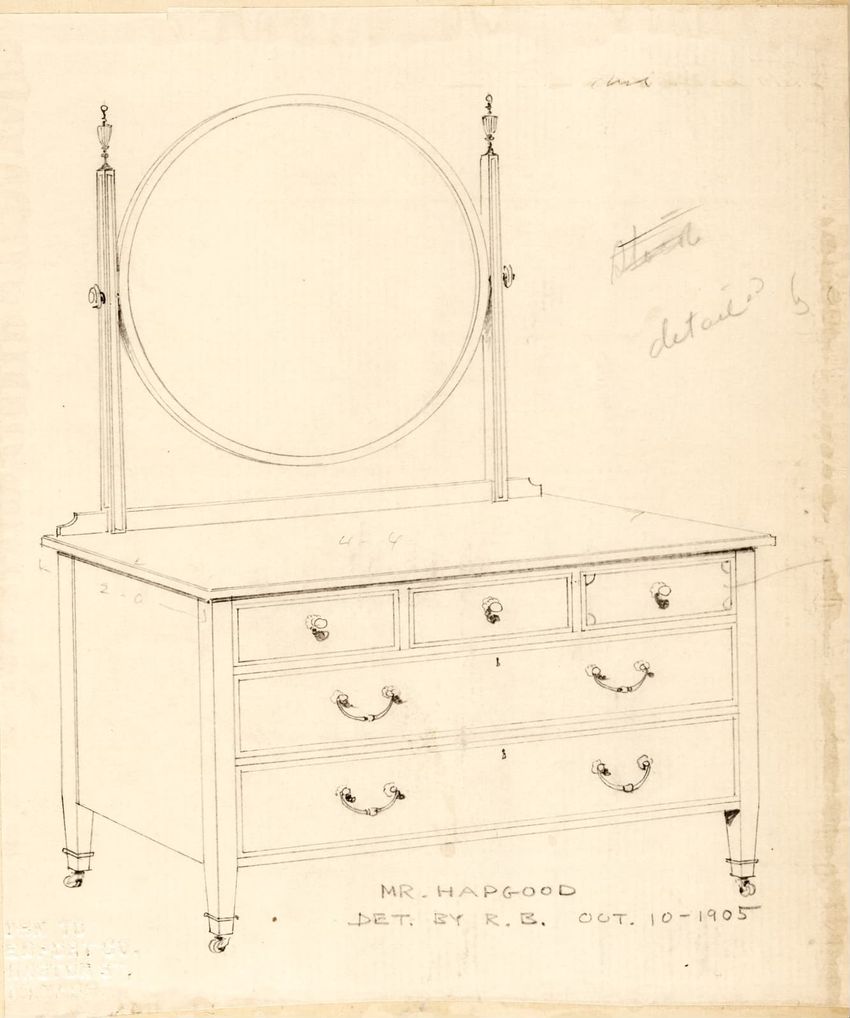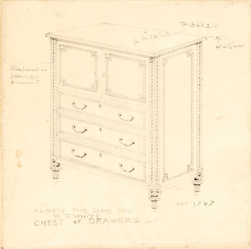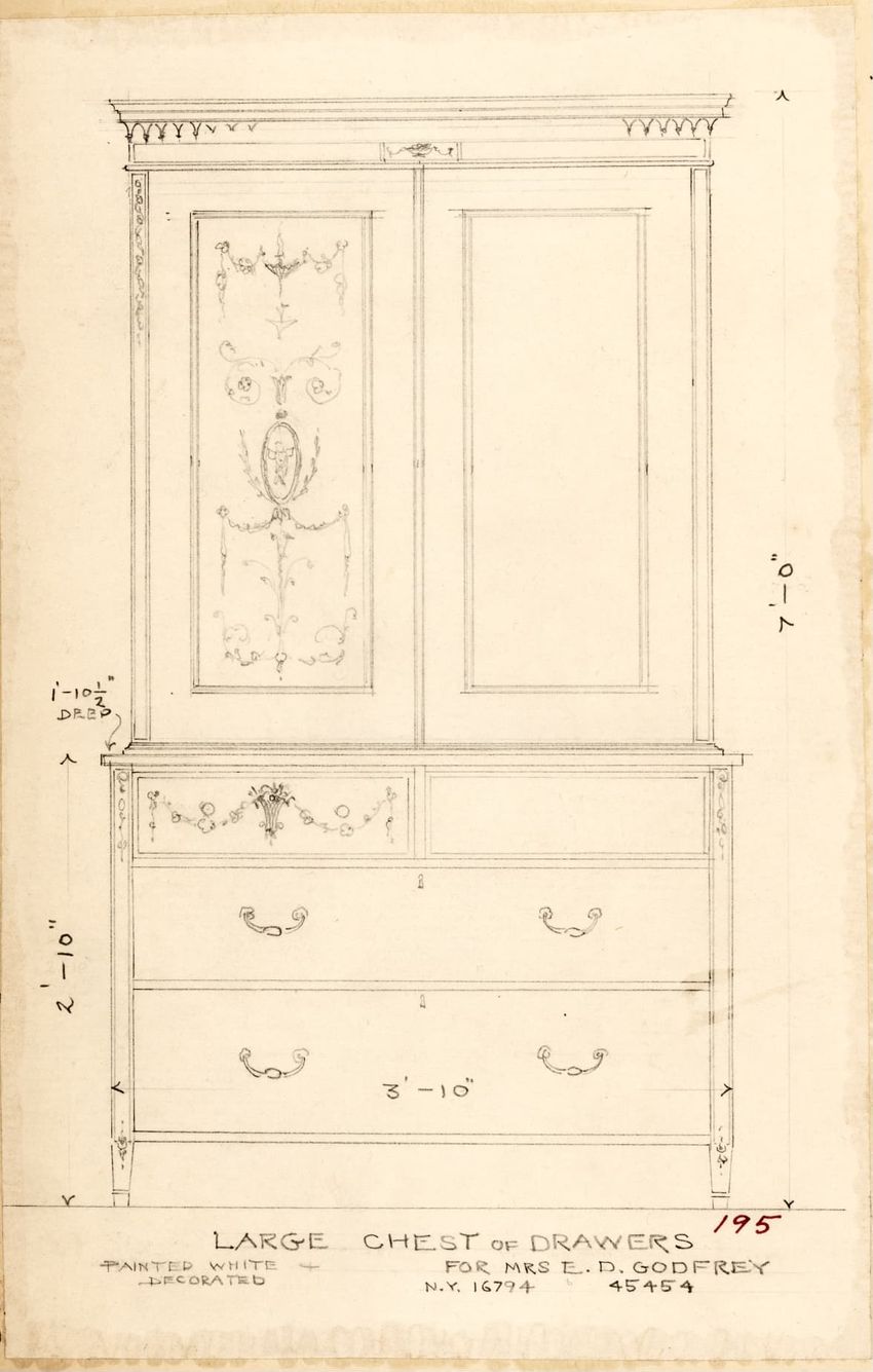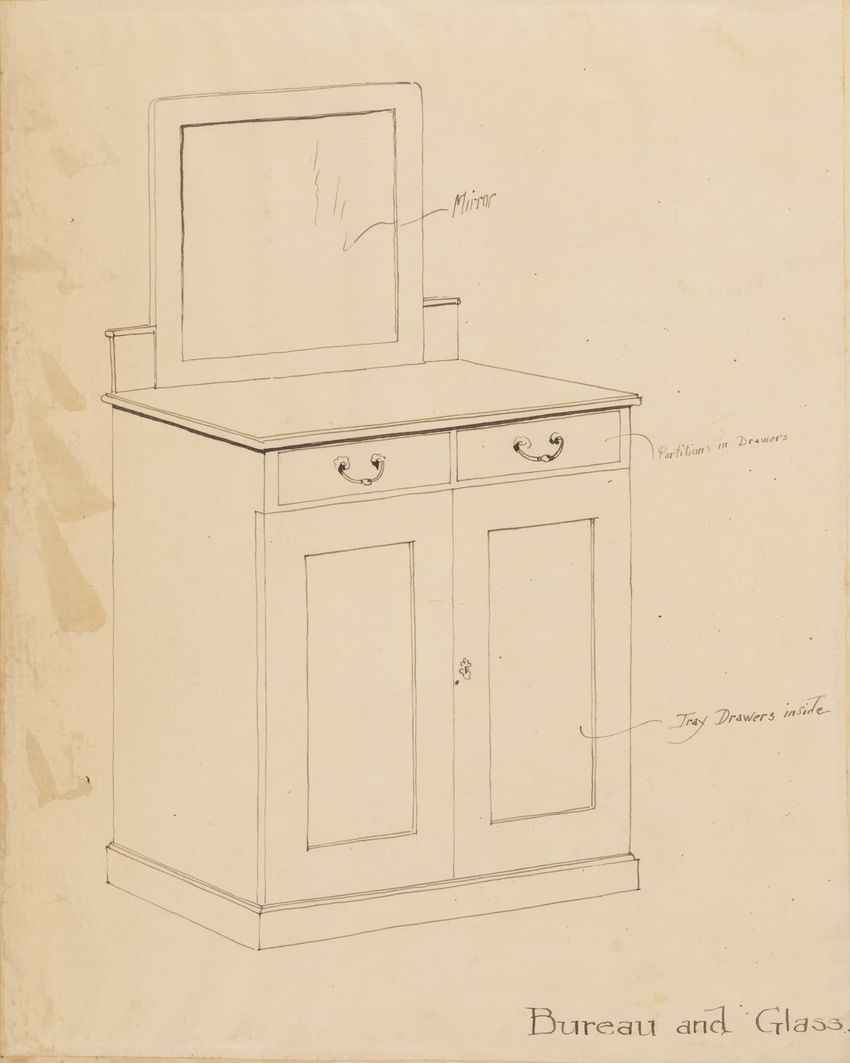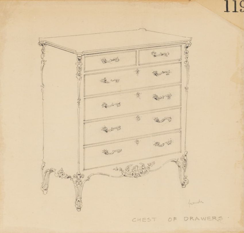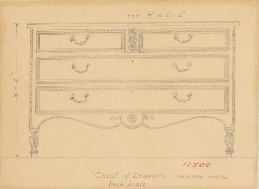 Untitled design drawing rendered in pencil on trace. Front and side views are shown. Rectangular bureau has overhanging top; four drawers with bail handles in a two-over-two arrangement; straight skirt; square stiles with carved, painted or inlaid trefoil motif and stringing; and tapered cylindrical...