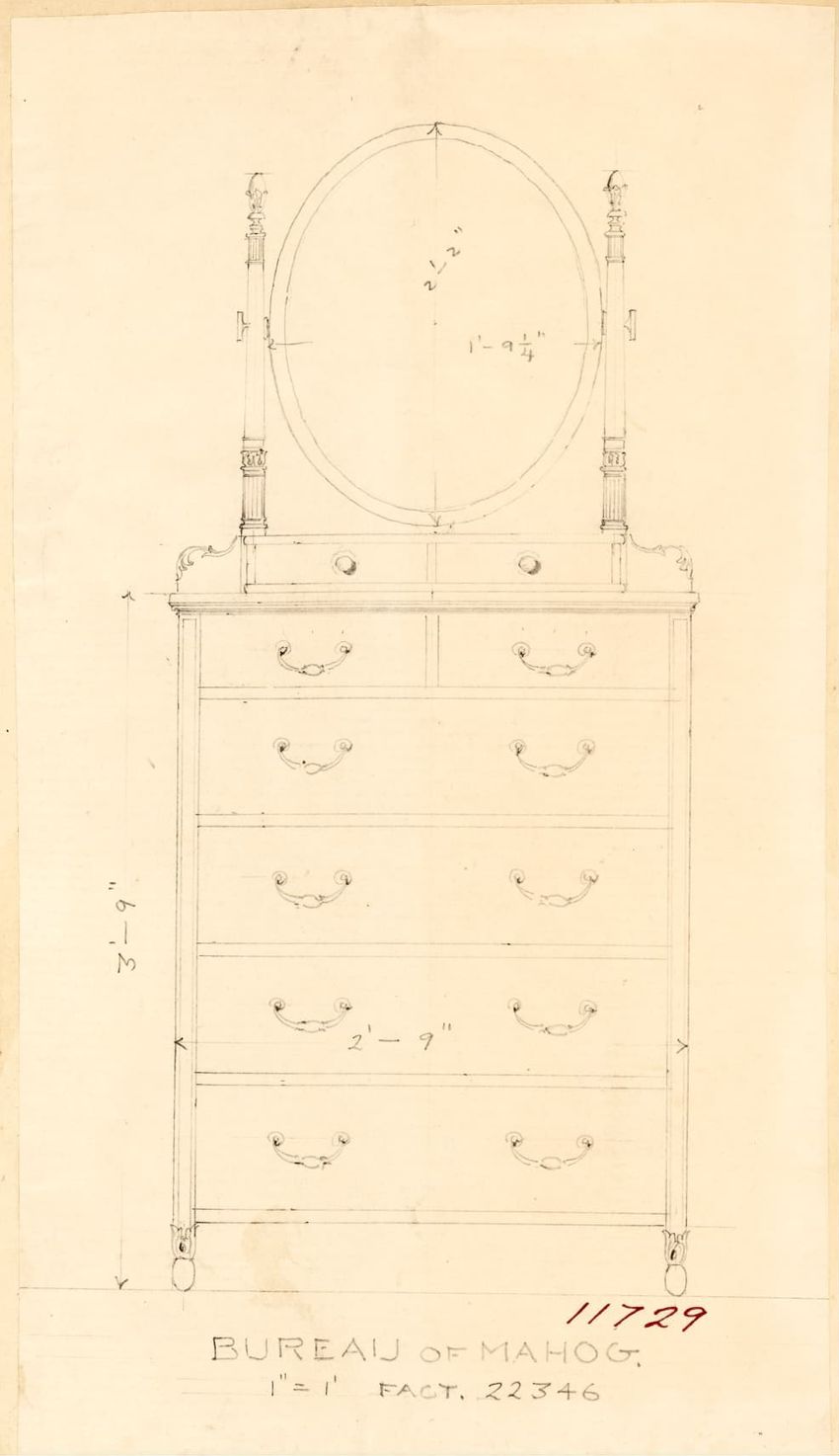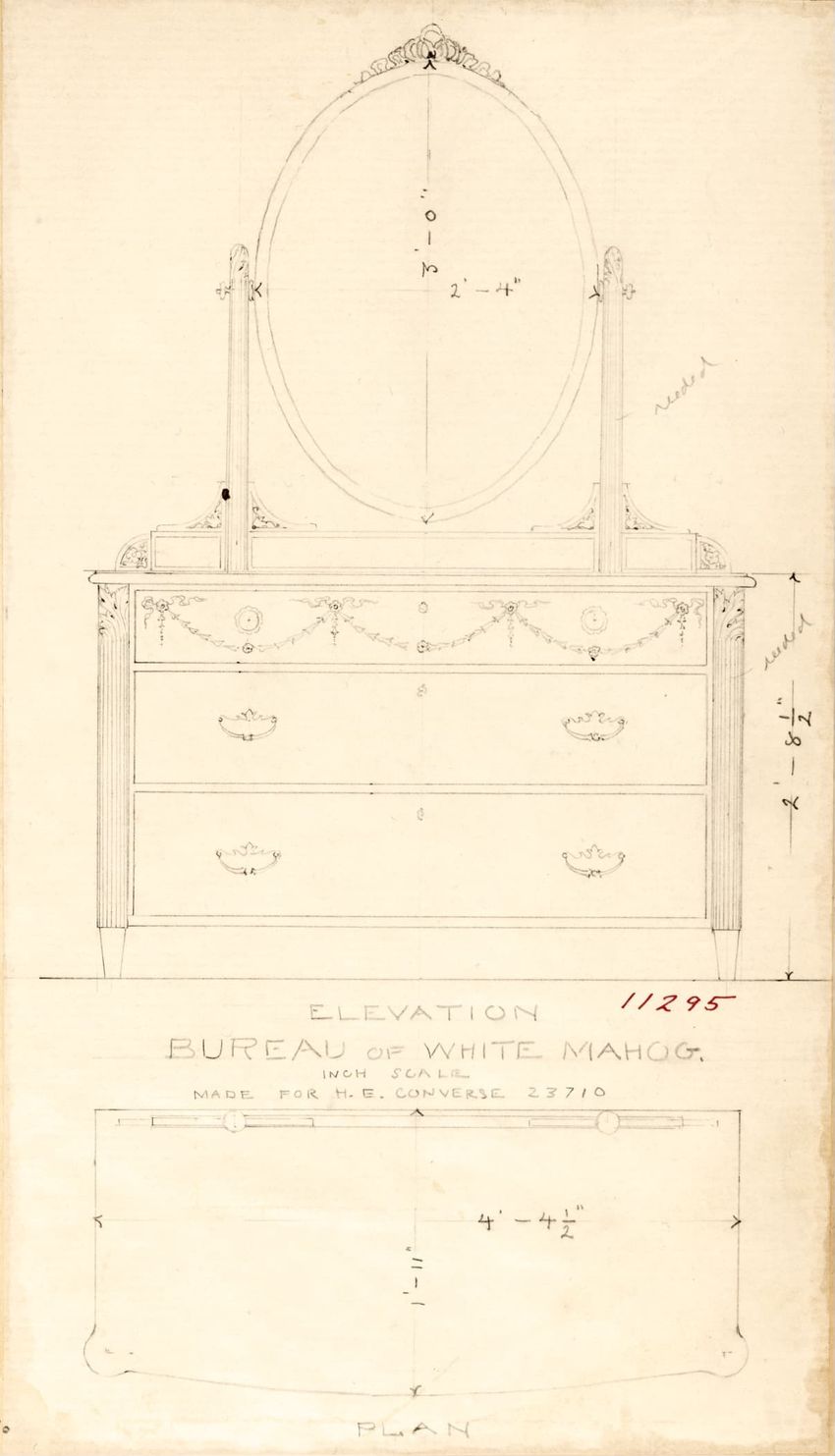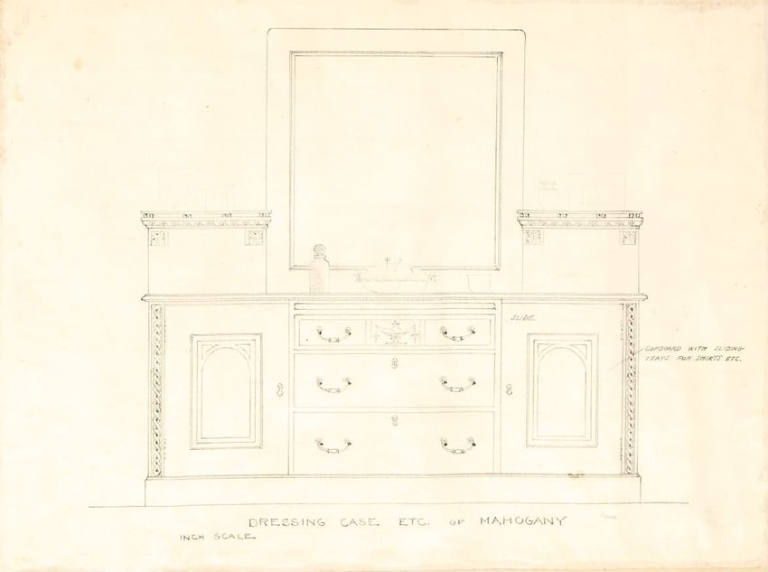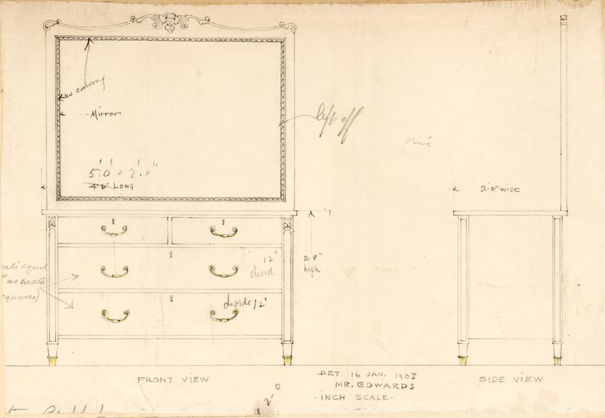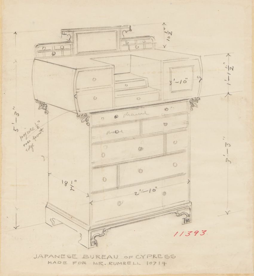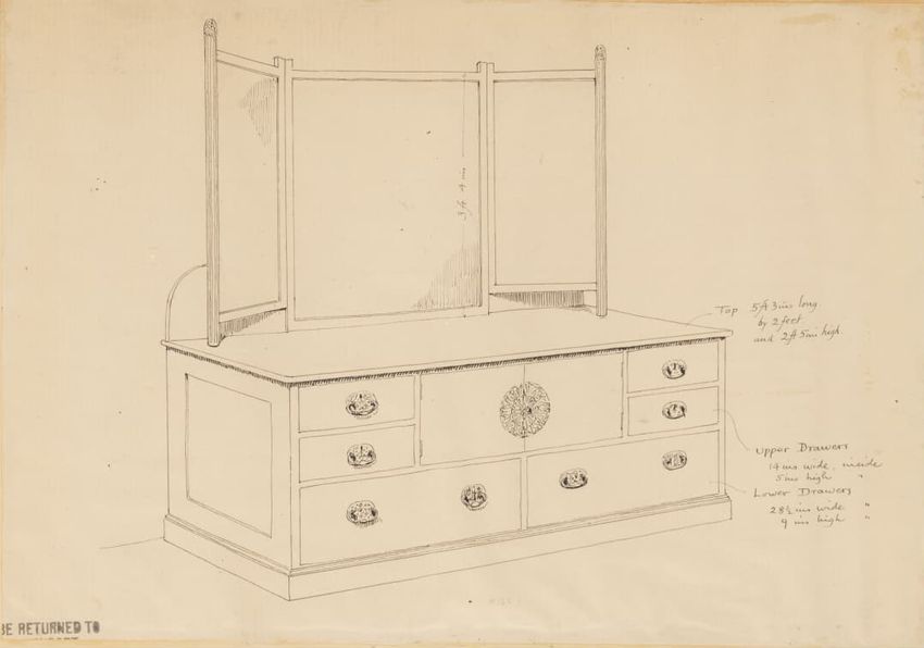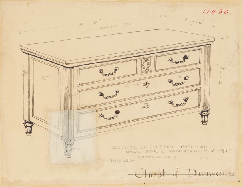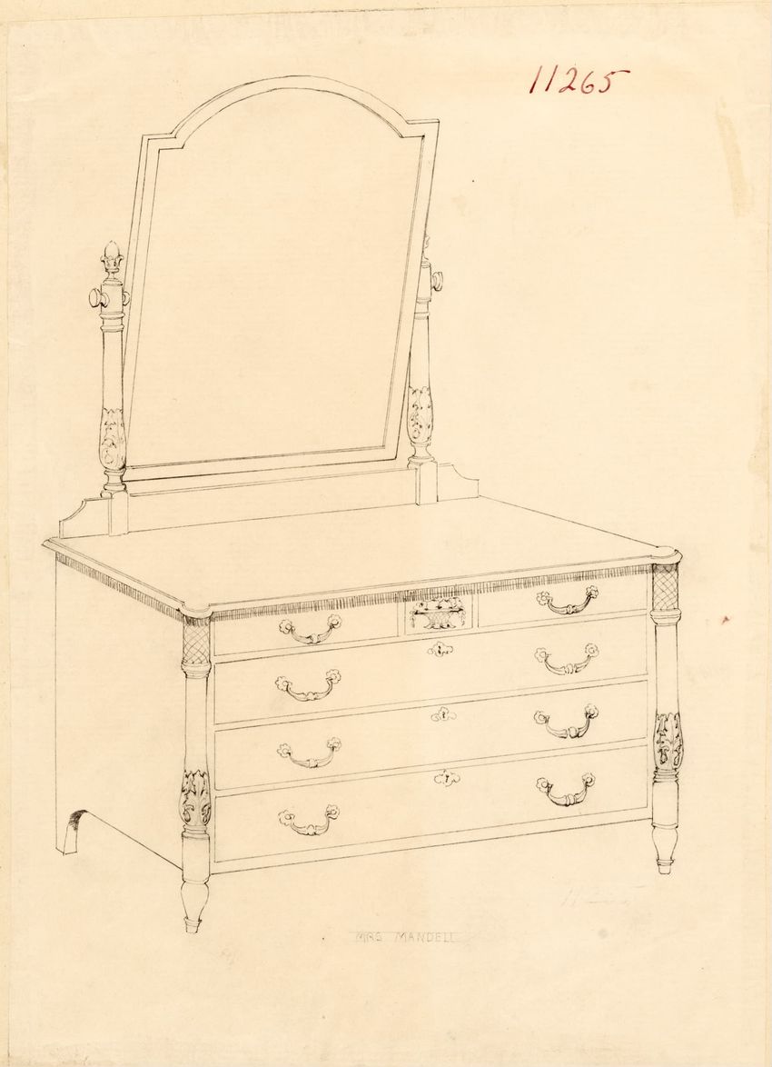 Untitled design drawing rendered in pencil on trace. Front and side views are shown. Rectangular bureau has overhanging top; four drawers with bail handles in a two-over-two arrangement; straight skirt; square stiles with carved, painted or inlaid trefoil motif and stringing; and tapered cylindrical...