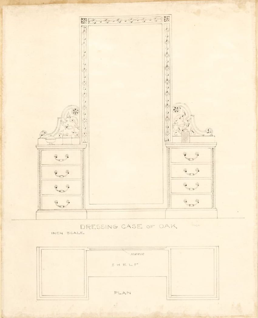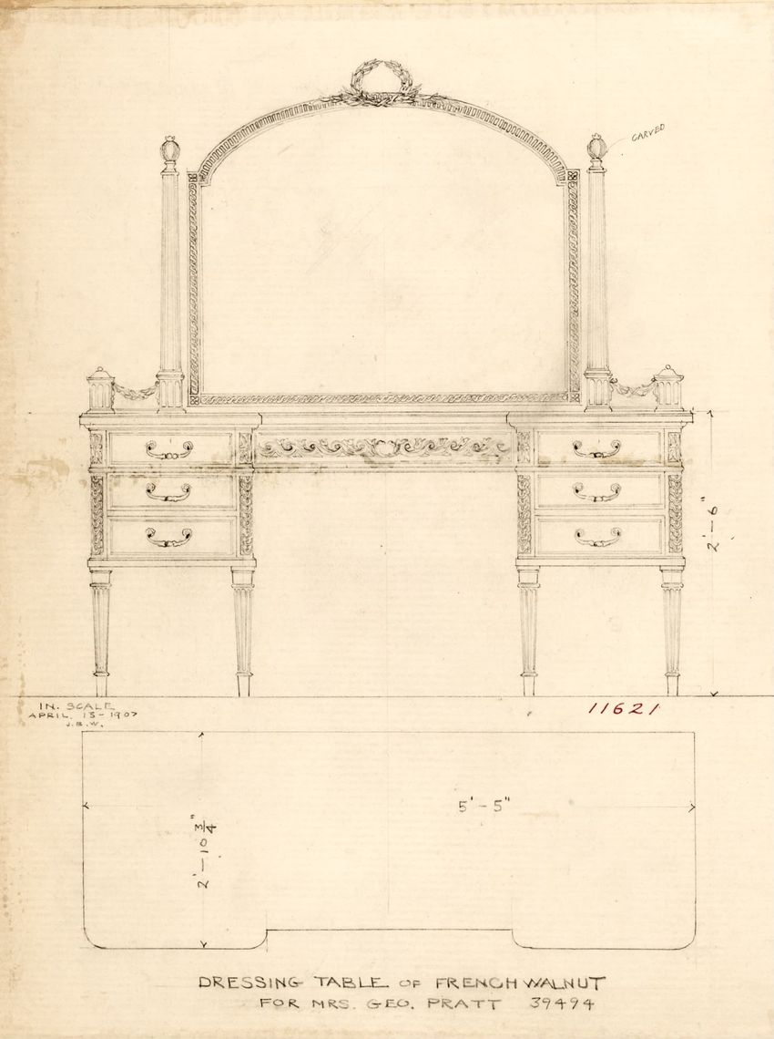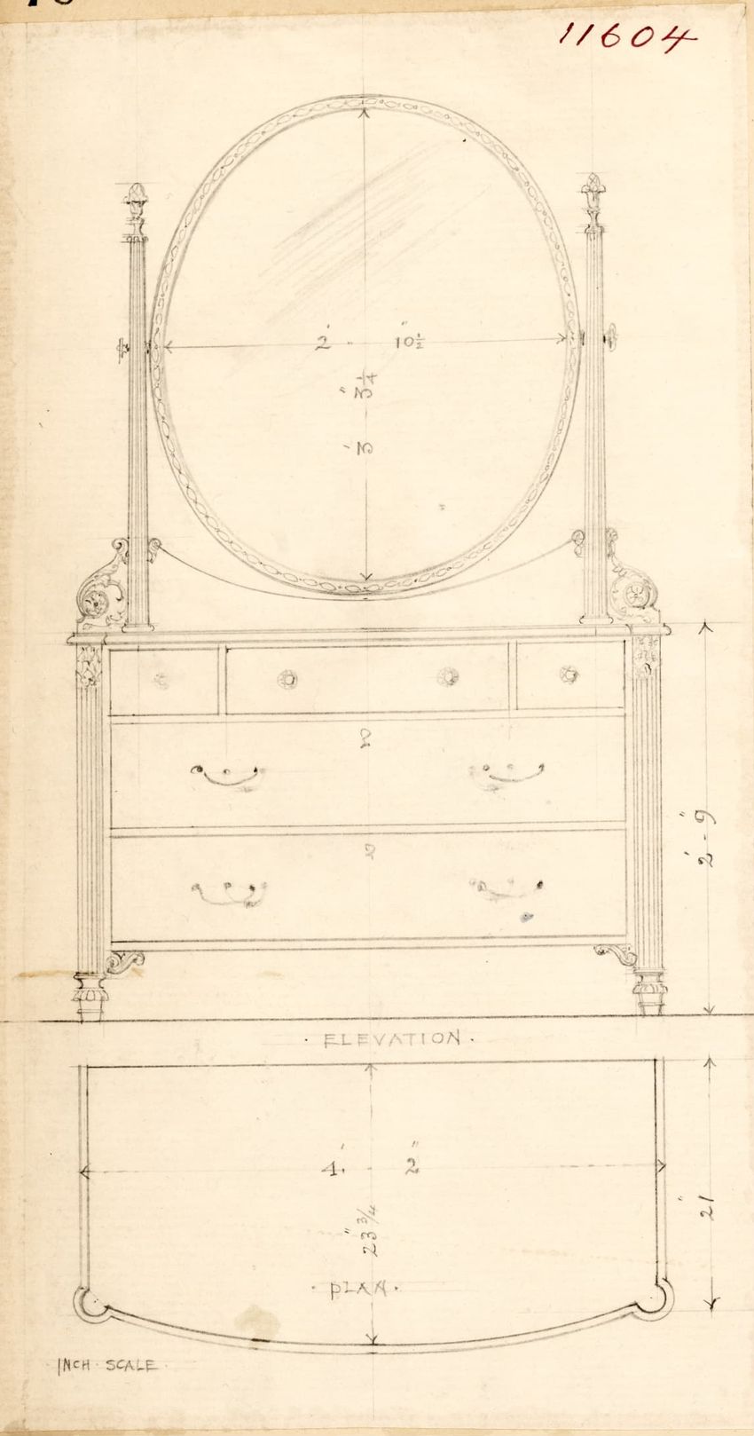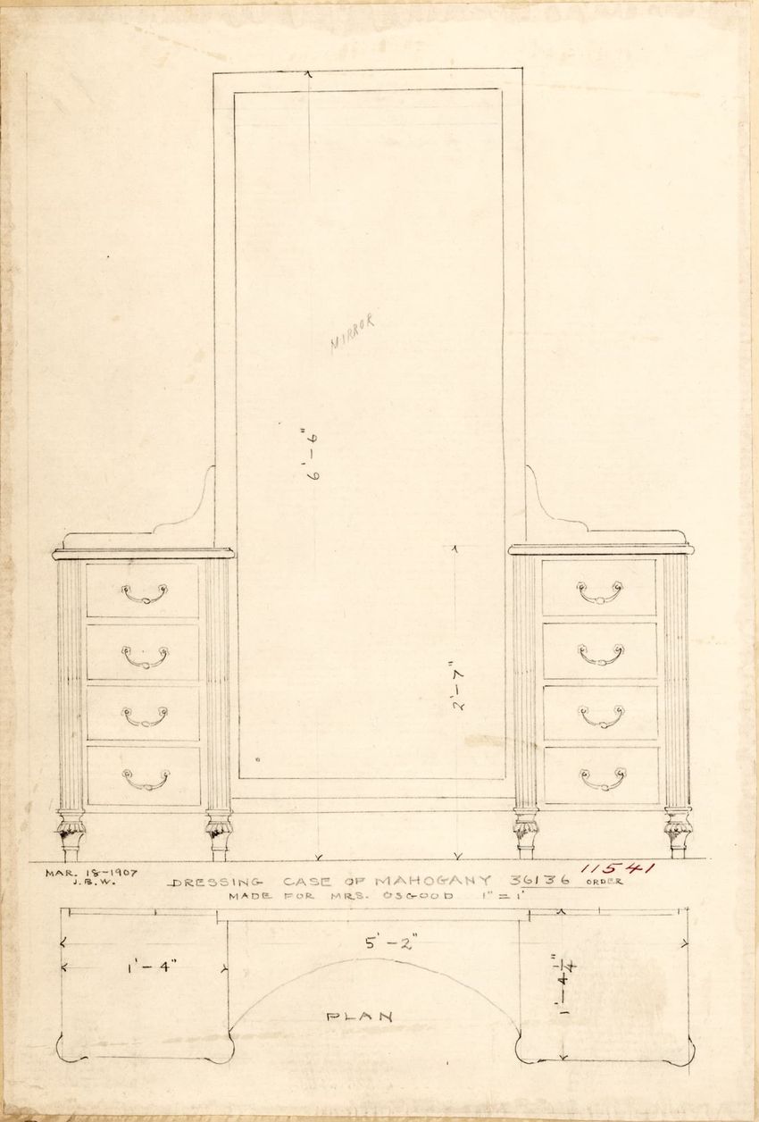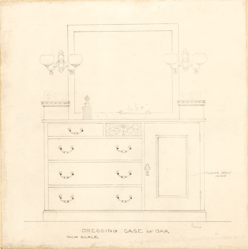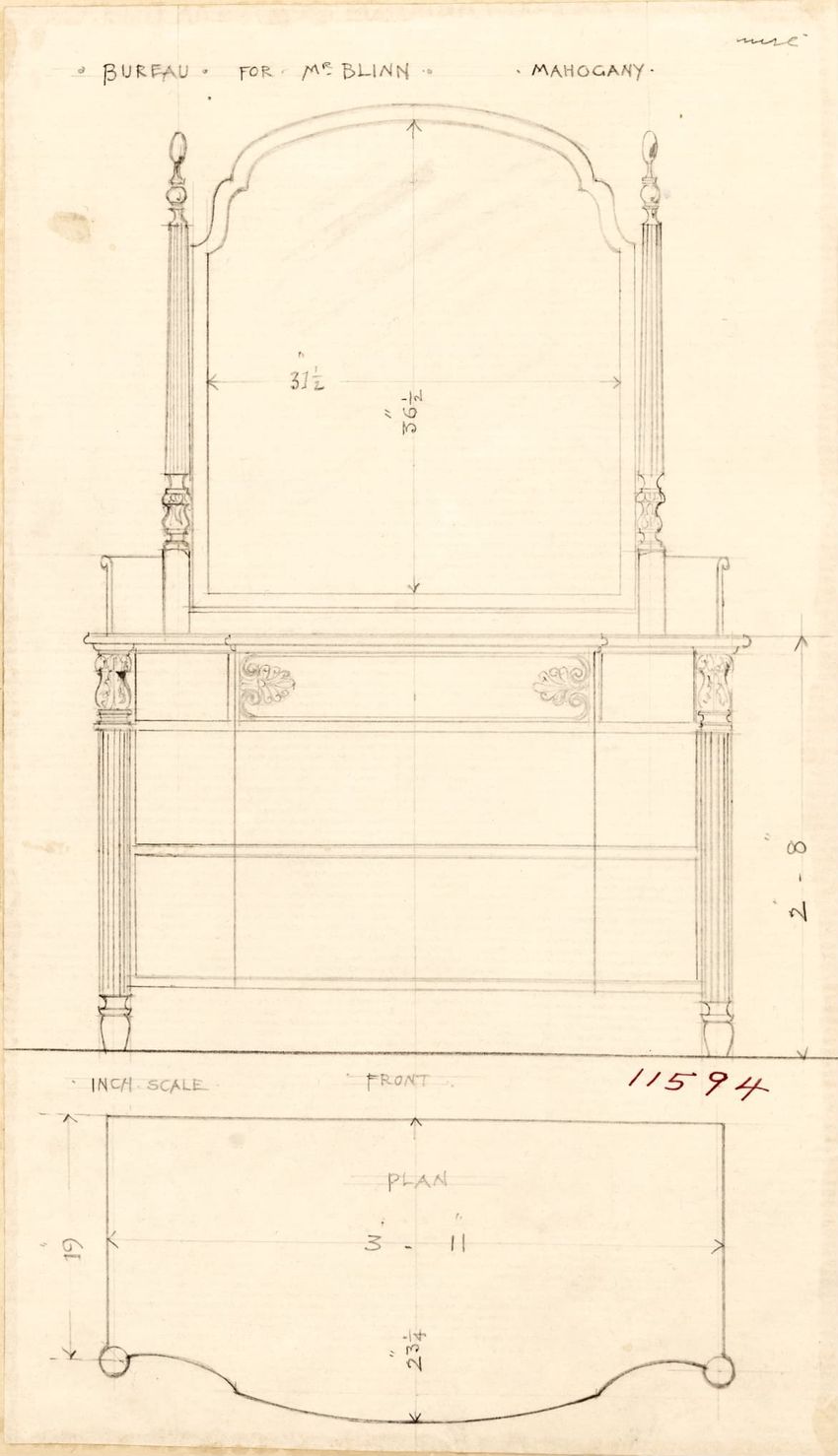 Untitled design drawing rendered in pencil on trace. Front and side views are shown. Rectangular bureau has overhanging top; four drawers with bail handles in a two-over-two arrangement; straight skirt; square stiles with carved, painted or inlaid trefoil motif and stringing; and tapered cylindrical...