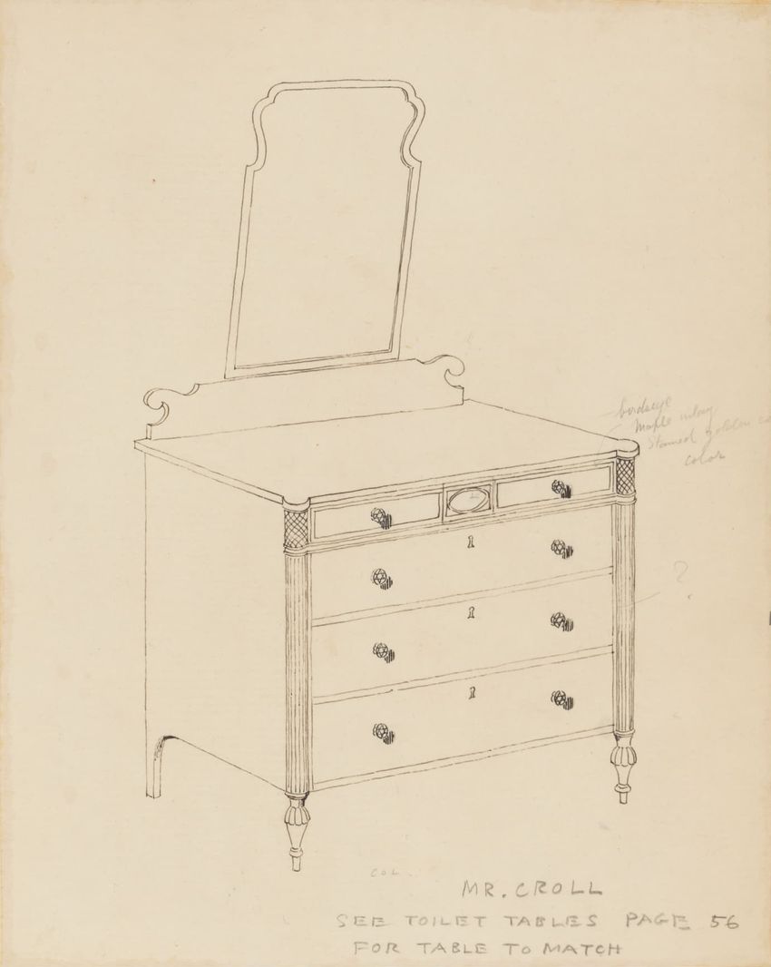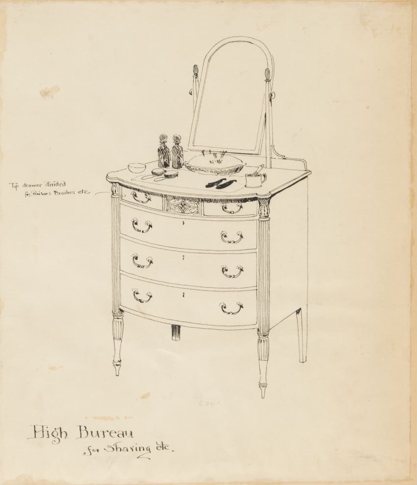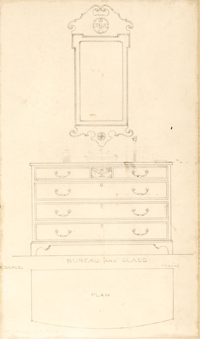 Design drawing titled "Bureau" rendered in pencil on trace. Front view is shown. Rectangular dresser has recessed top compartment with three shallow drawers having round pulls; overhanging top; projecting top drawer with curved front and central carved leaf motif, followed by three slightly recessed...