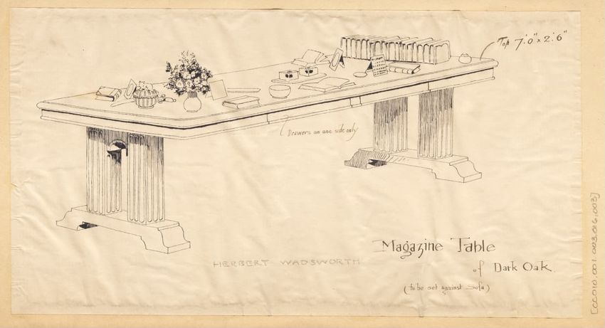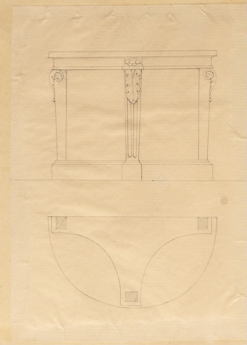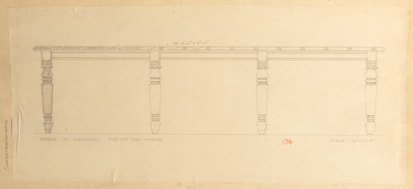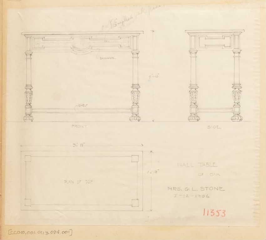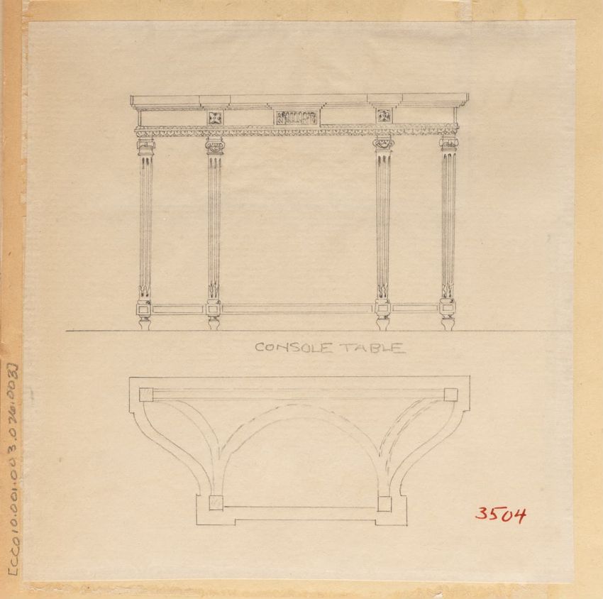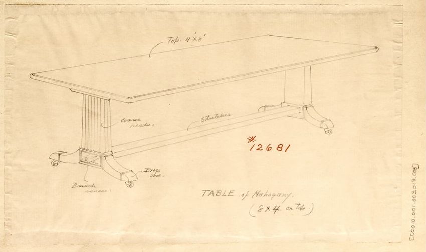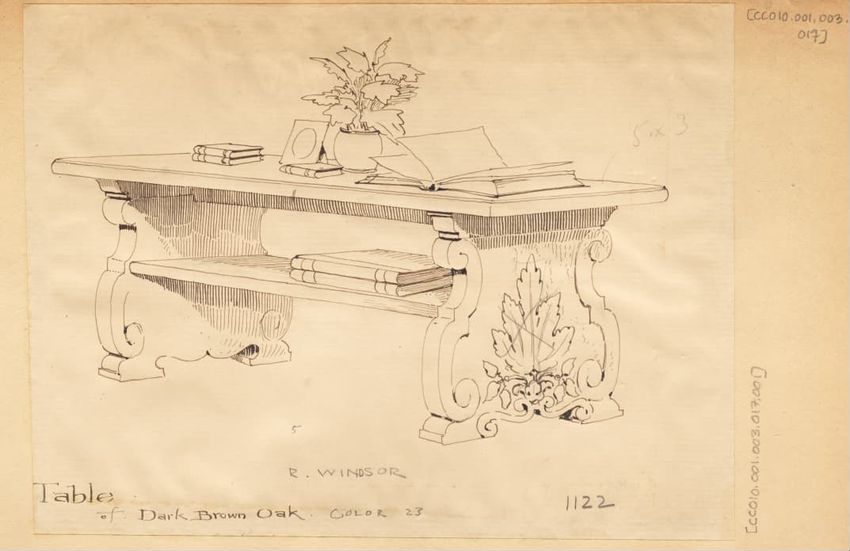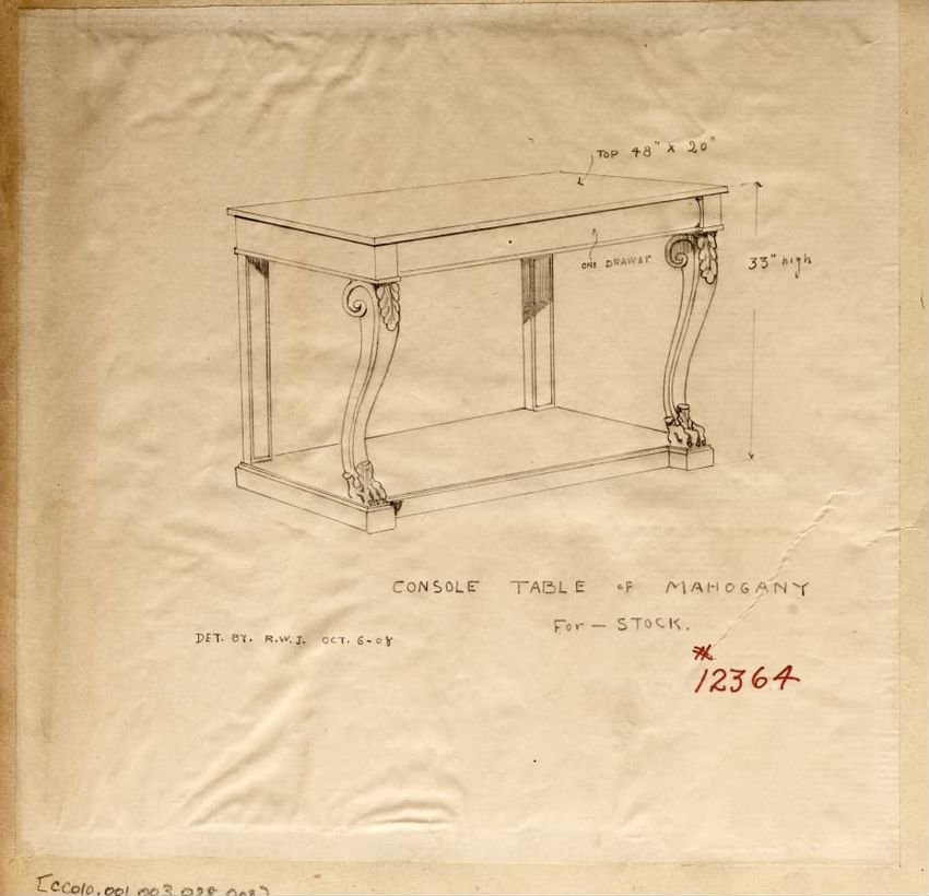 Untitled design drawing rendered in pencil on trace. Perspective view is shown. Rectangular table has overhanging top with molded edge; apron with two shallow drawers with bail handles, shaped lower edge, and applied half-spindles on corners and between drawers; two rear legs with ovoid, ring, ball,...