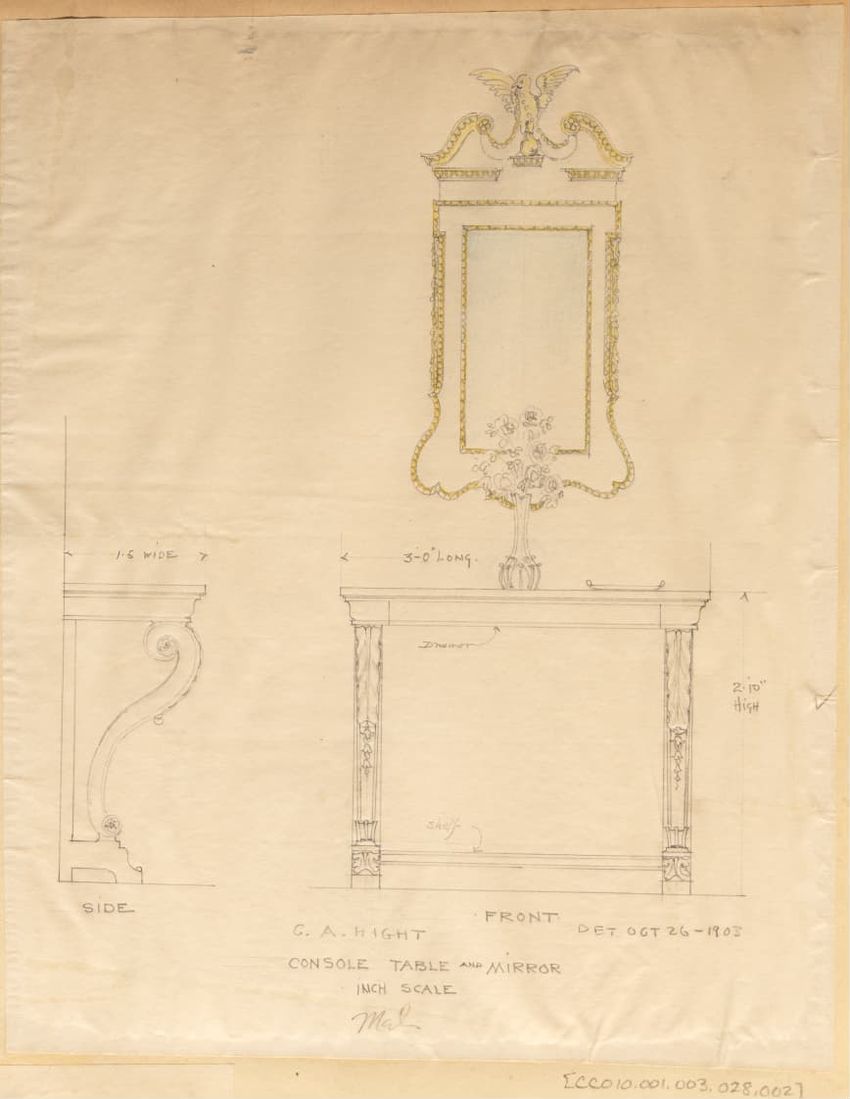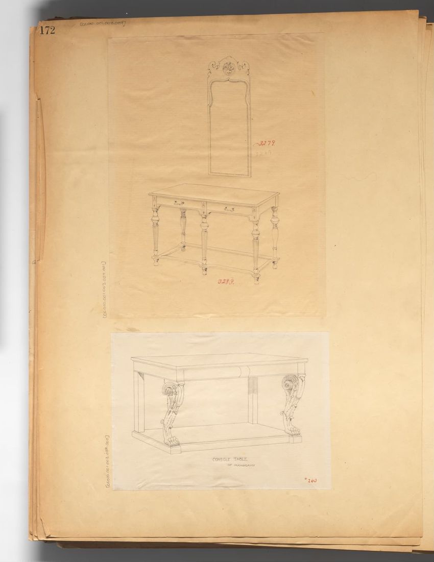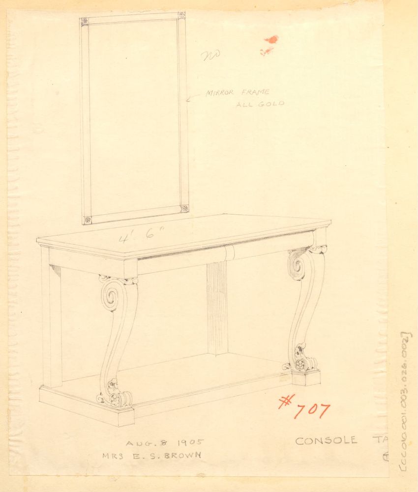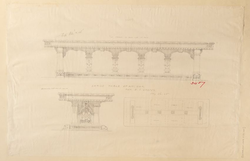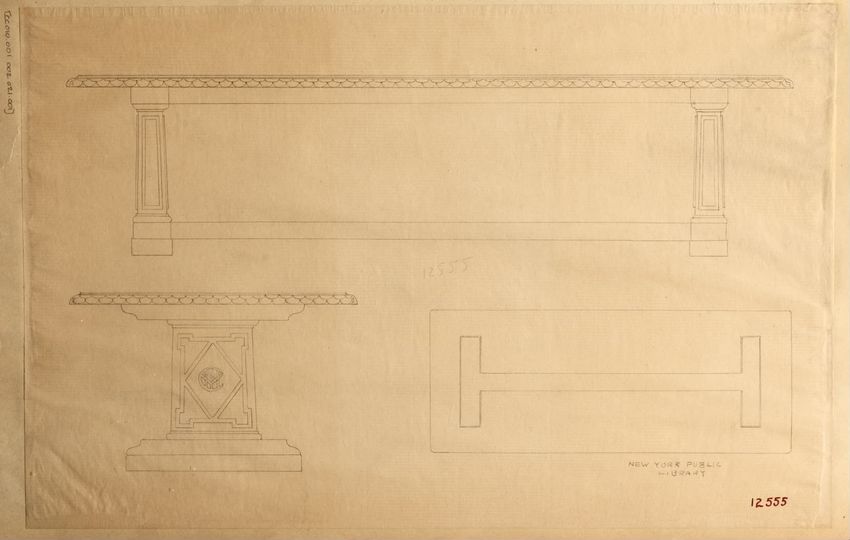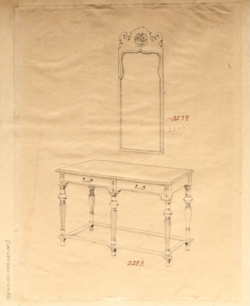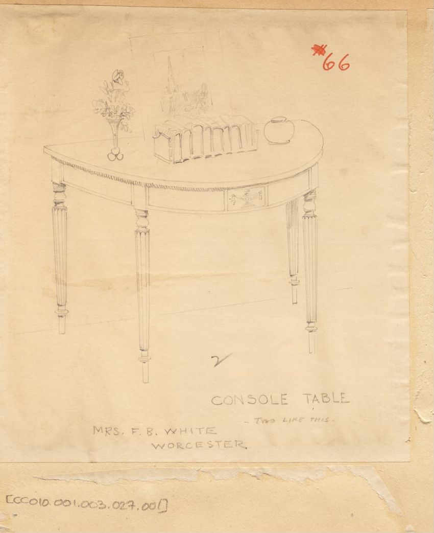 Untitled design drawing rendered in pencil on trace. Perspective view is shown. Rectangular table has overhanging top with molded edge; apron with two shallow drawers with bail handles, shaped lower edge, and applied half-spindles on corners and between drawers; two rear legs with ovoid, ring, ball,...