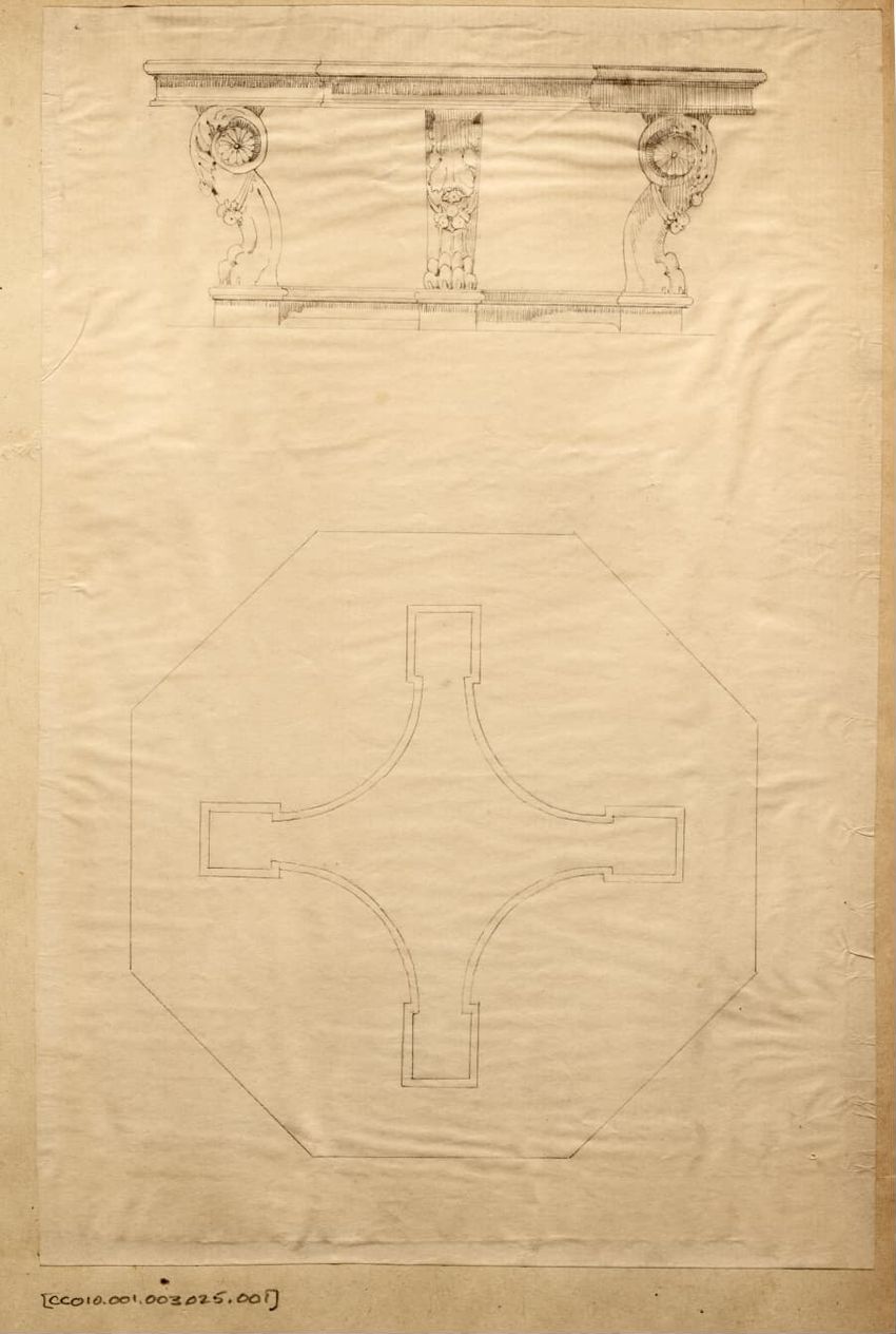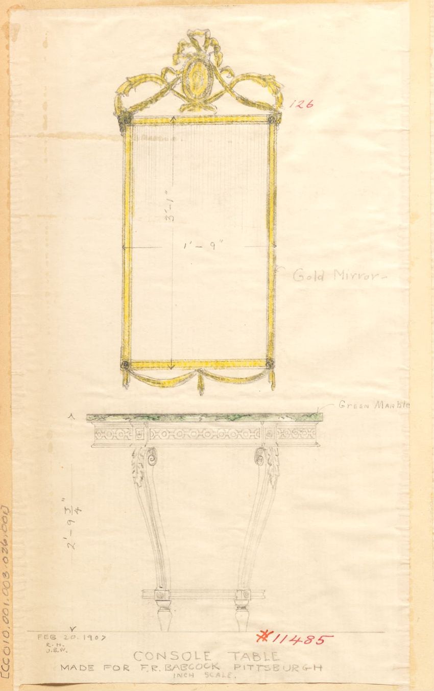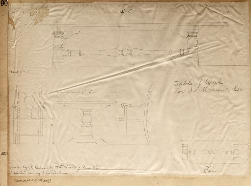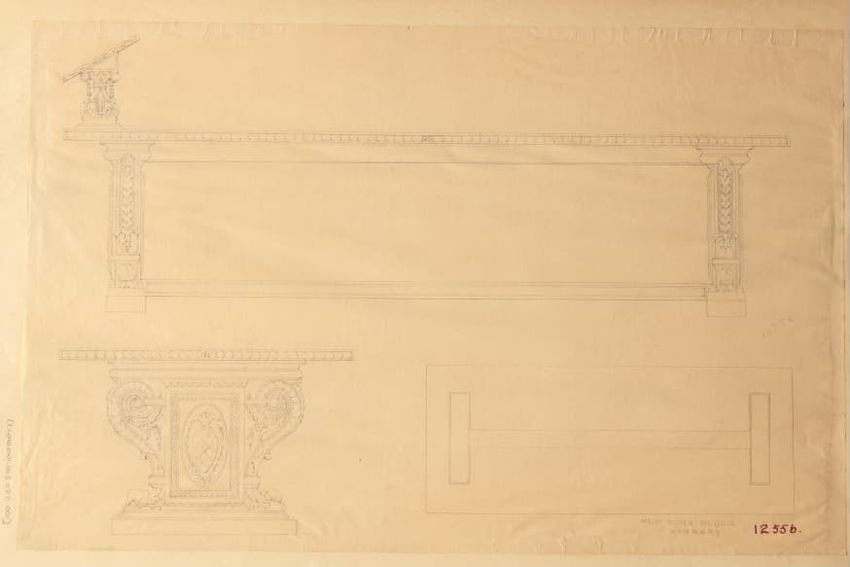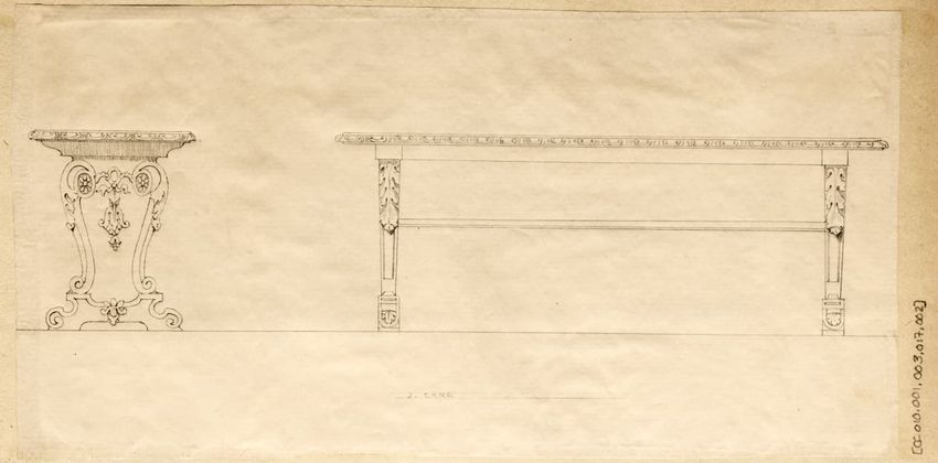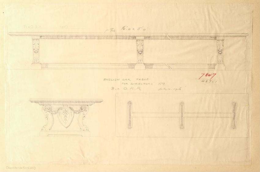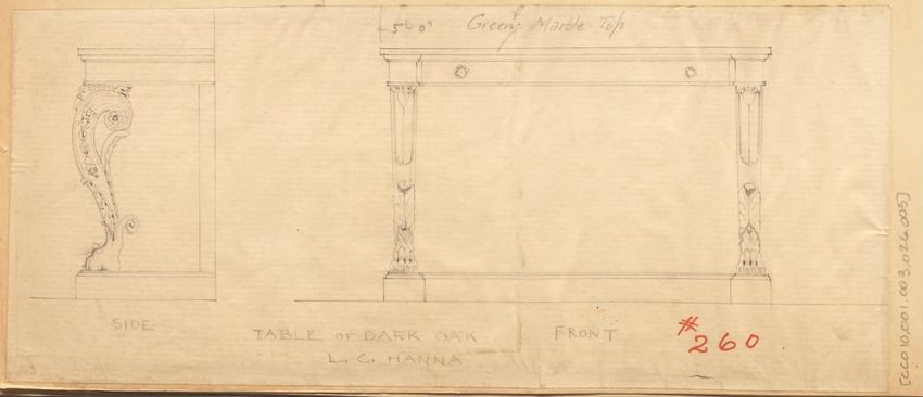 Untitled design drawing rendered in pencil on trace. Perspective view is shown. Rectangular table has overhanging top with molded edge; apron with two shallow drawers with bail handles, shaped lower edge, and applied half-spindles on corners and between drawers; two rear legs with ovoid, ring, ball,...