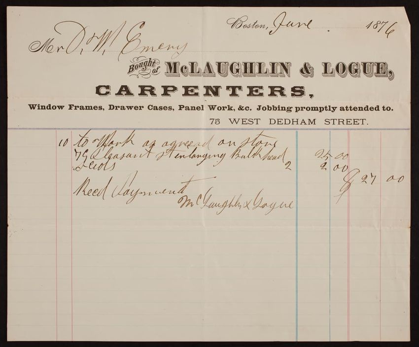 Billhead for McLaughlin & Logue, carpenters, 75 West Dedham Street, Boston, Mass, dated June, 1876