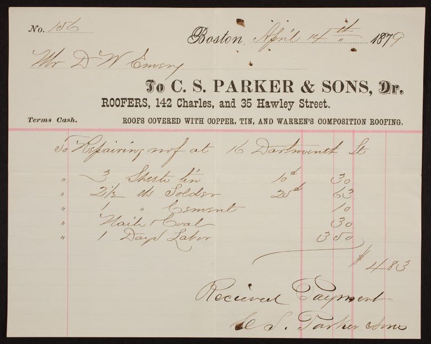 Billhead for C.S. Parker & Sons, Dr., roofers, 142 Charles and 35 Hawley Street, Boston, Mass., dated April 14, 1879