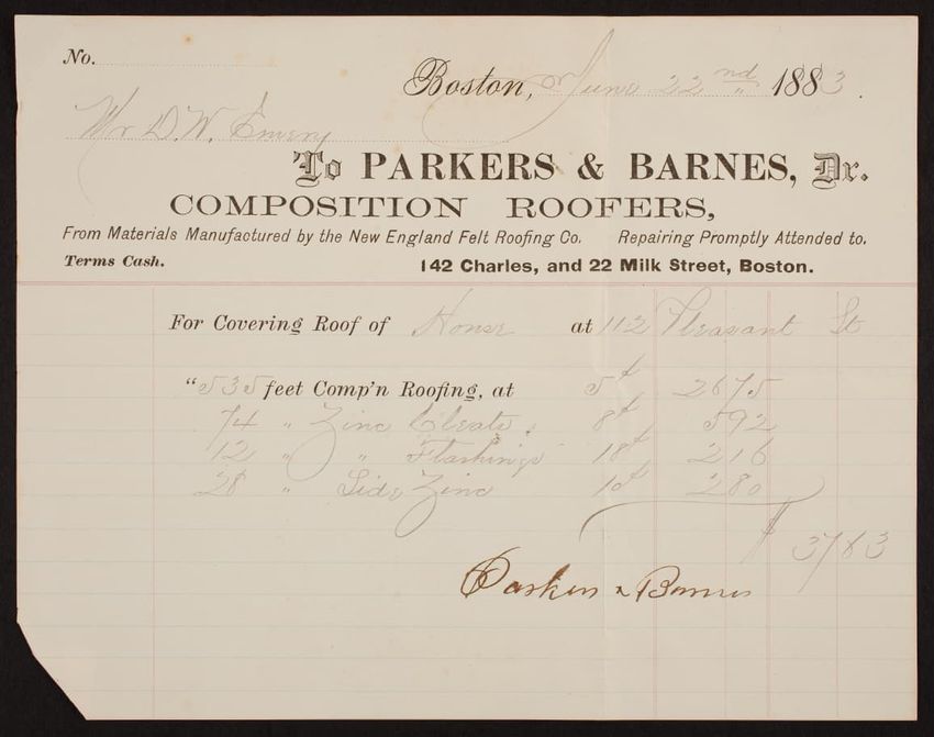 Billhead for Parkers & Barnes, Dr., composition roofers, 142 Charles Street and 22 Milk Street, Boston, Mass., dated June 22, 1883