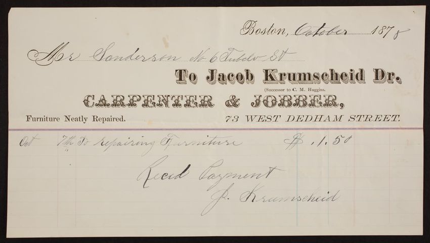 Billhead for Jacob Krumscheid, Dr., carpenter & jobber, 73 West Dedham Street, Boston, Mass., dated October, 1878