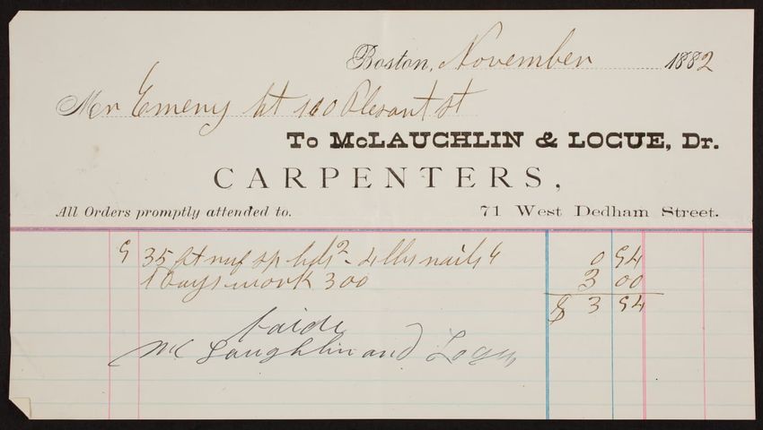 Billhead for McLaughlin & Logue, Dr., carpenters, 71 West Dedham Street, Boston, Mass, dated November, 1882