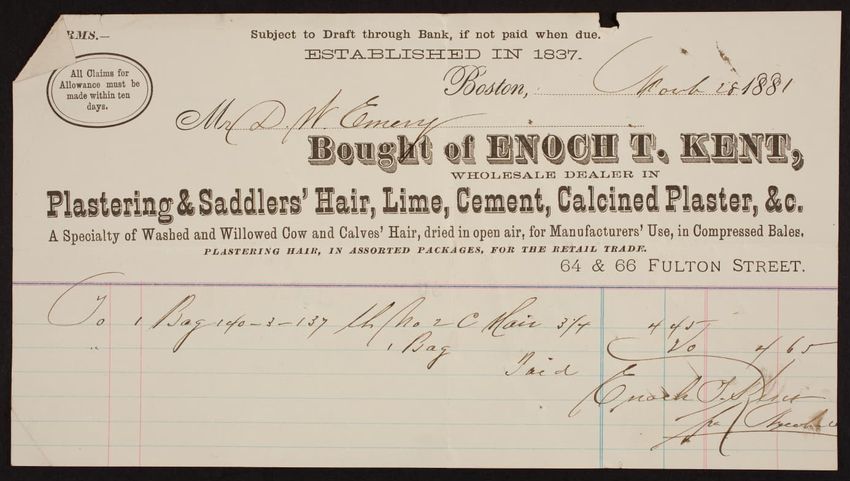 Billhead for Enoch T. Kent, plastering & saddlers' hair, lime, cement, calcined plaster, 64 & 66 Fulton Street, Boston, Mass., dated March 28, 1881