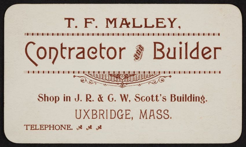 Trade card for T.F. Malley, contractor and builder, Scott Building, Uxbridge, Mass., undated