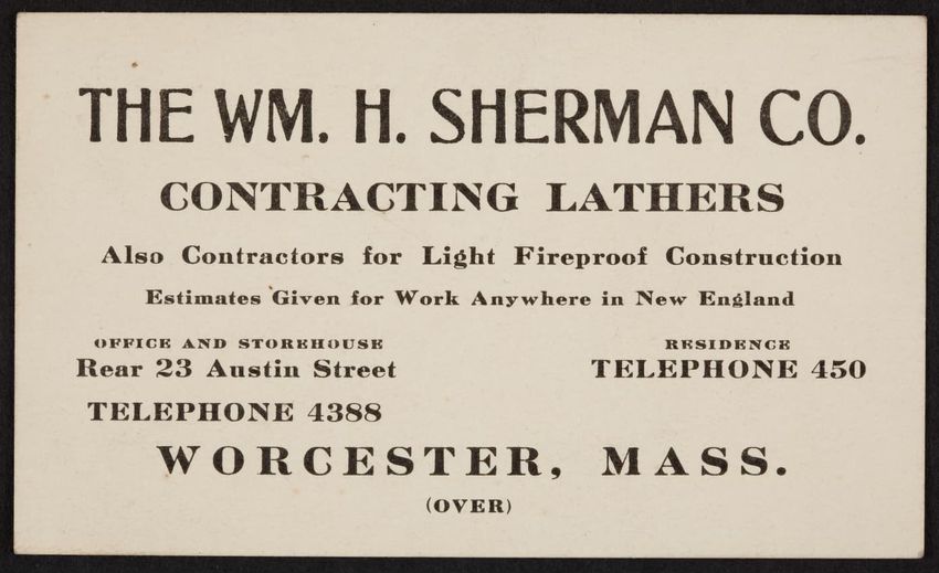 Trade card for The Wm. H. Sherman Co., contracting lathers, 23 Austin Street, Worcester, Mass., undated