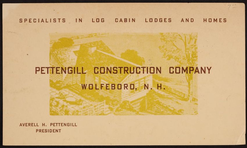 Trade card for the Pettengill Construction Company, specialists in log cabin lodges and homes, Wolfeboro, New Hampshire, undated