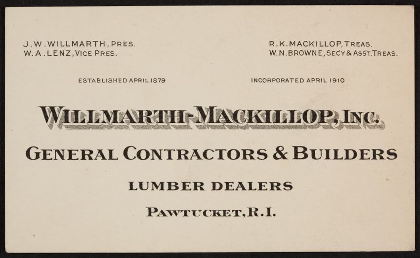 Trade card for Willmarth-Mackillop, Inc., general contractors & builders, Pawtucket, Rhode Island, undated