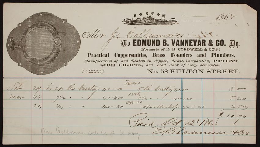 Billhead for Edmund B. Vannevar & Co., practical coppersmiths, brass founders and plumbers, No. 58 Fulton Street, Boston, Mass., dated 1868