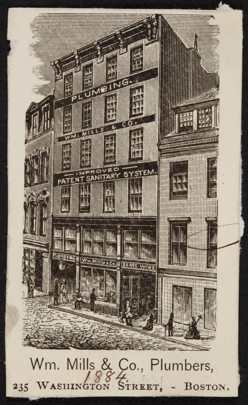 Advertisement for Wm. Mills & Co., plumbers, 235 Washington Street, Boston, Mass., 1884
