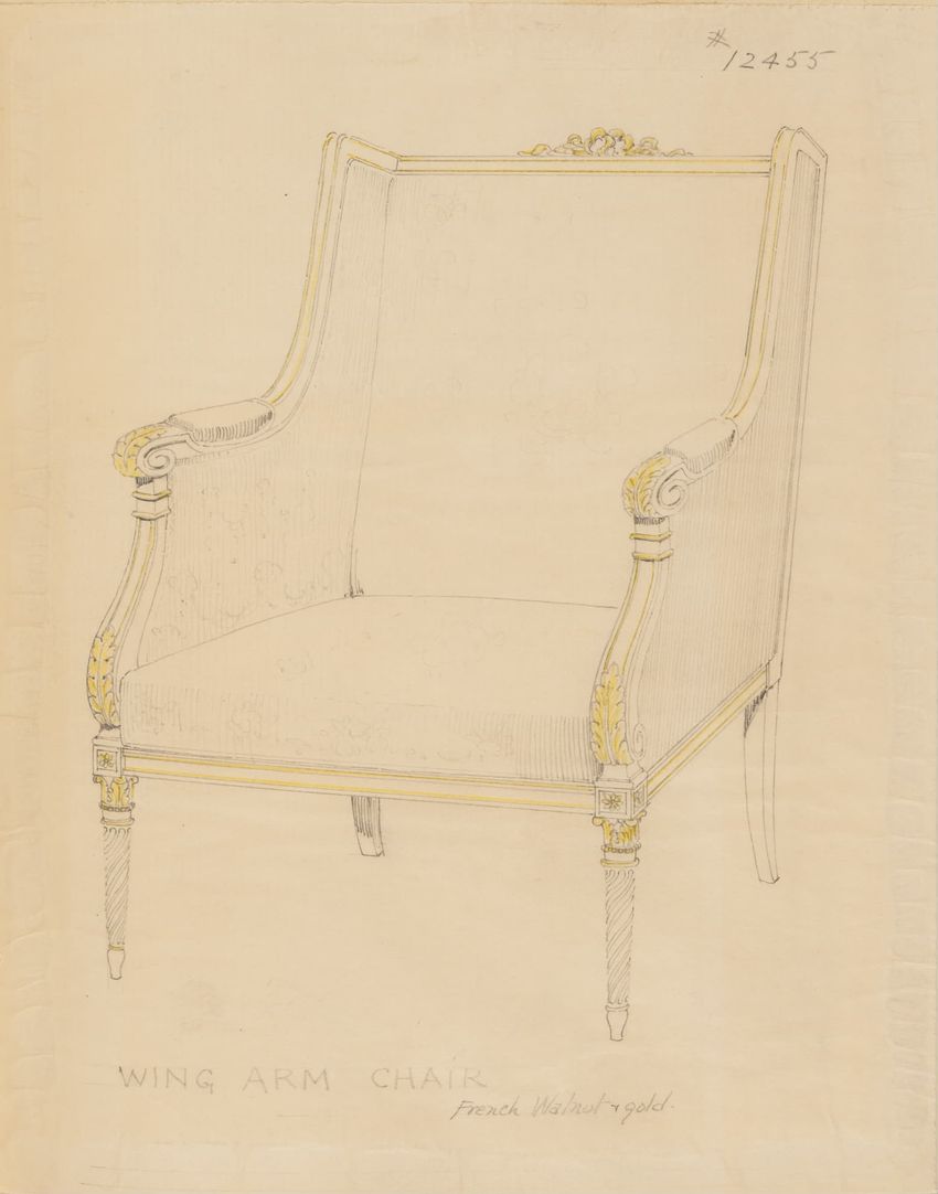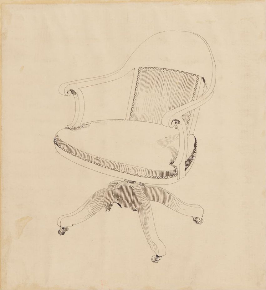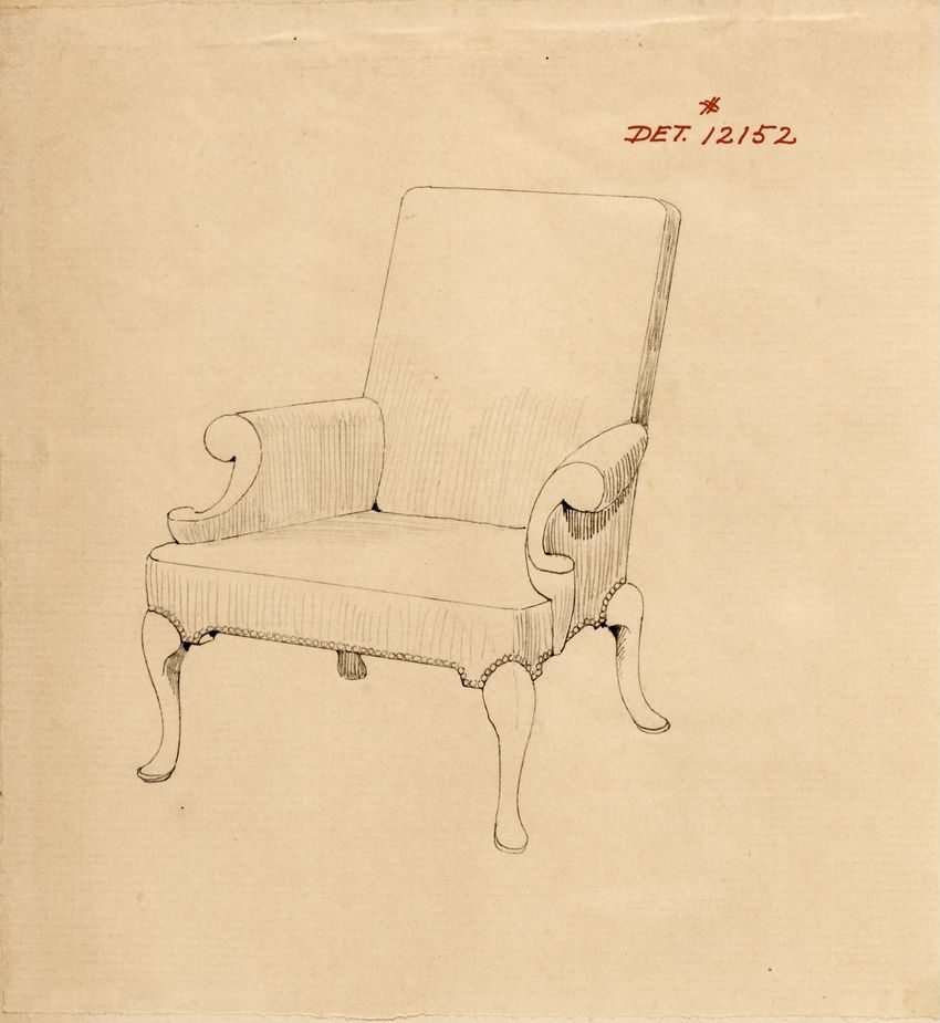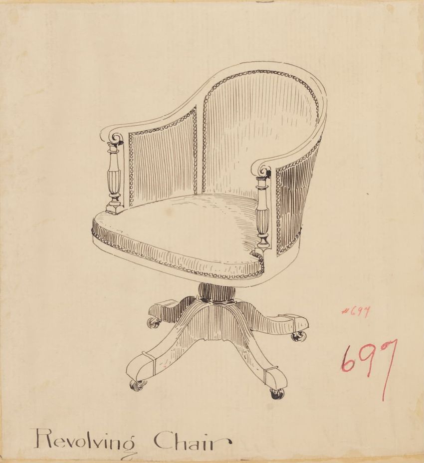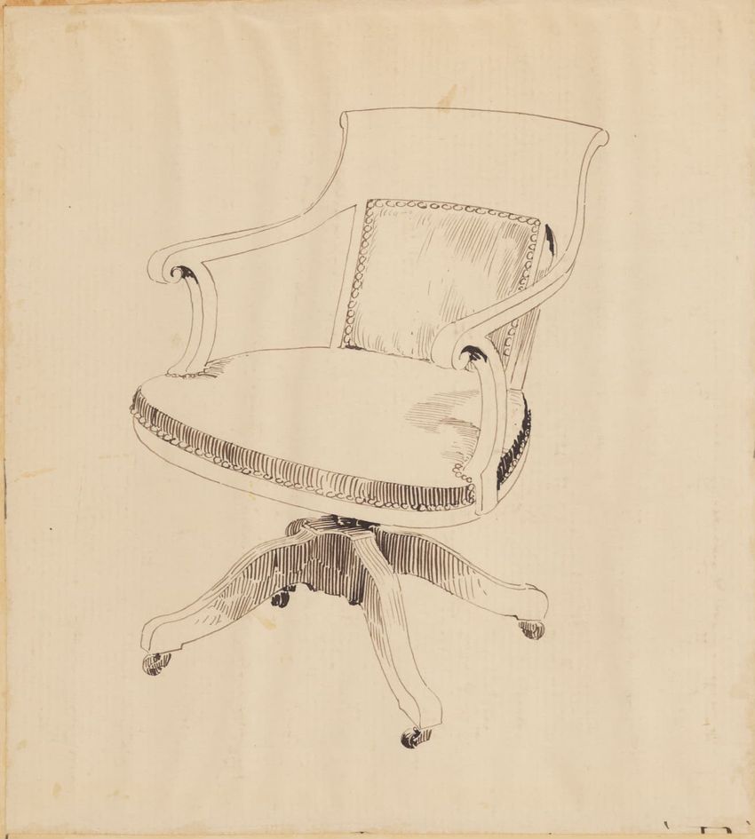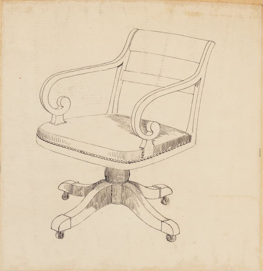 Untitled design drawing rendered in pencil on trace. Perspective view is shown. Swivel arm chair has curved back; molded rounded crest rail and continuous shaped arms with carved scrolled handholds; shaped curved arm supports with foliate carving at base; upholstered back, sides, arm pads, and seat ...