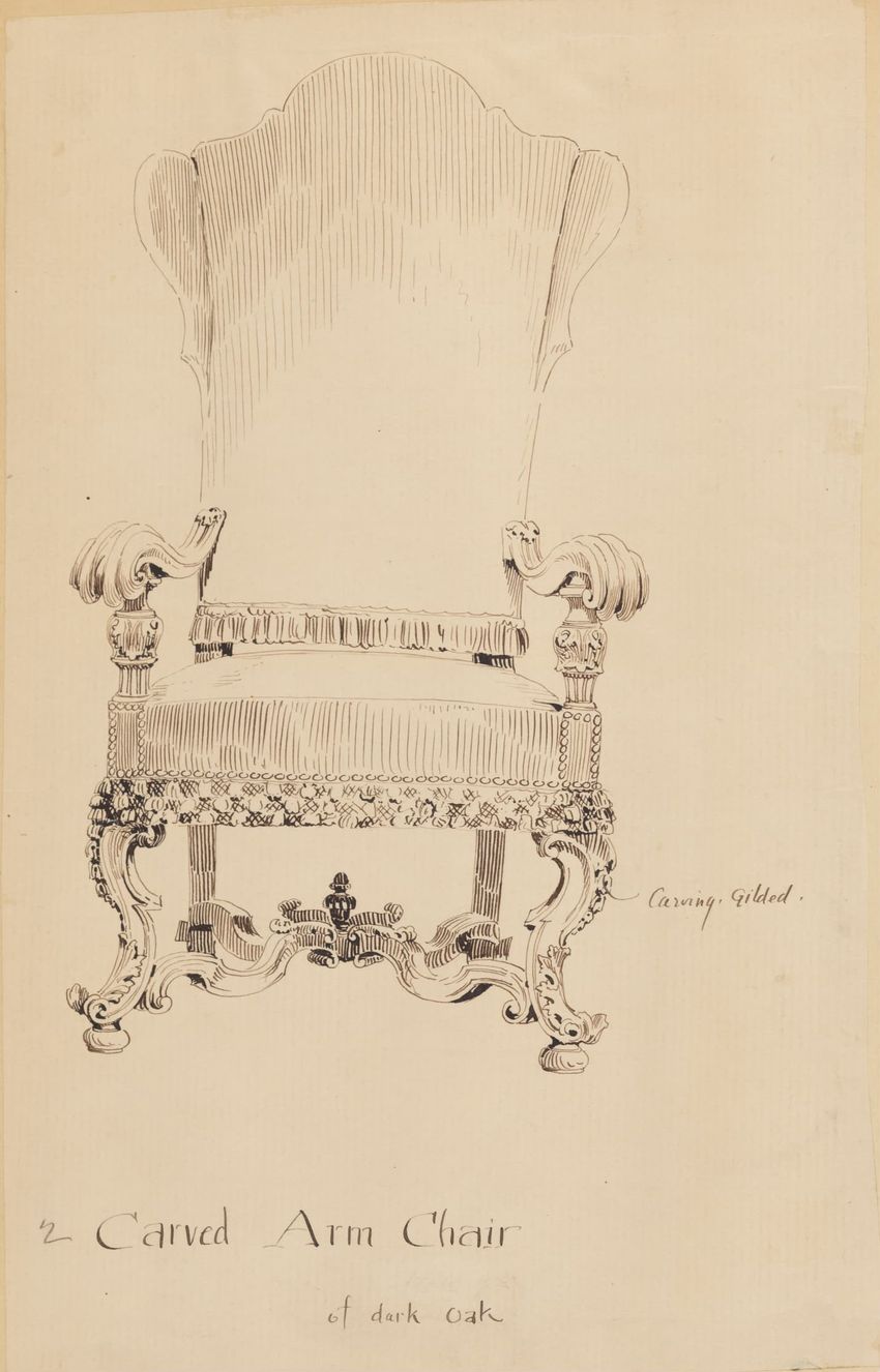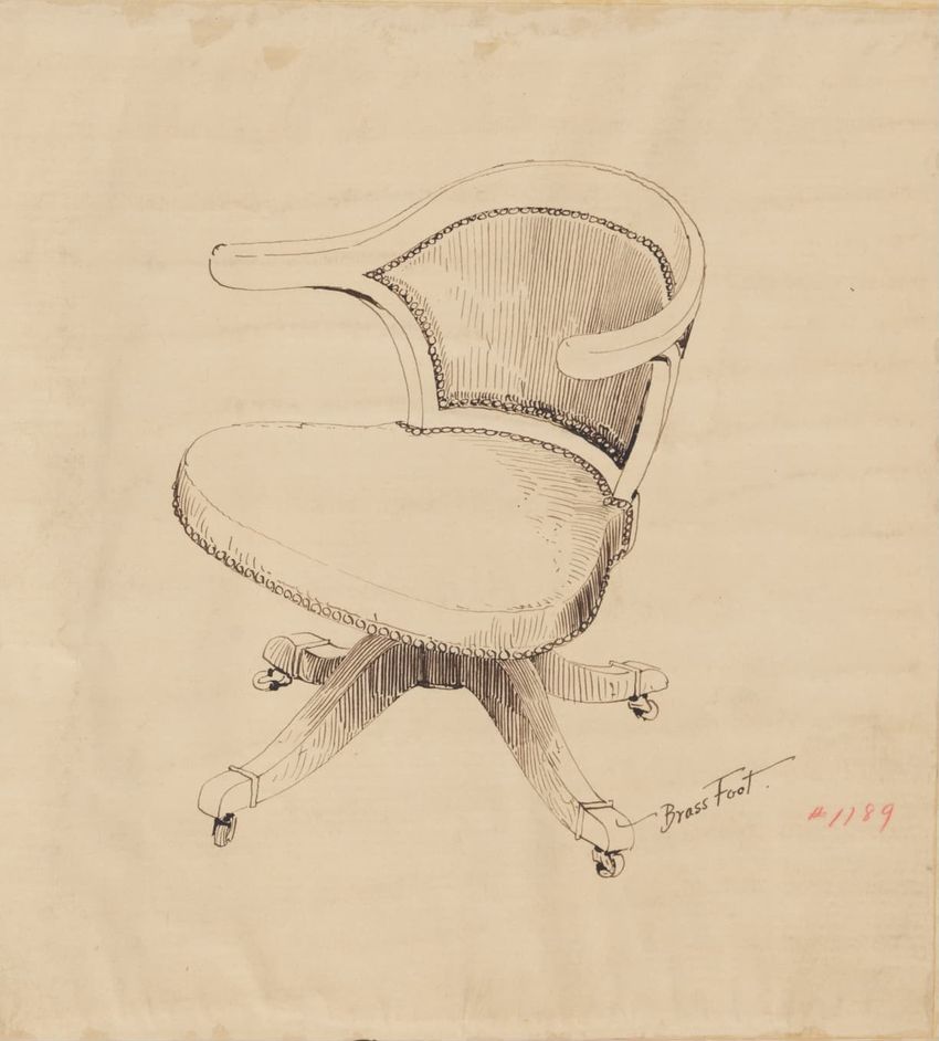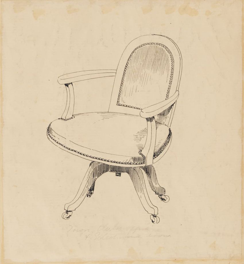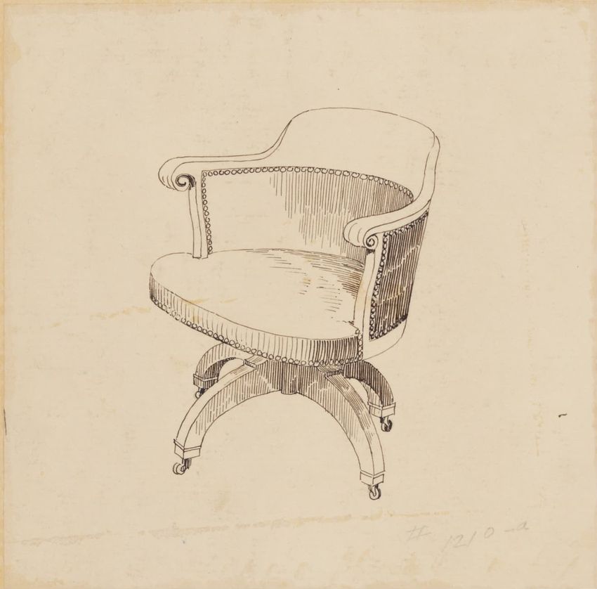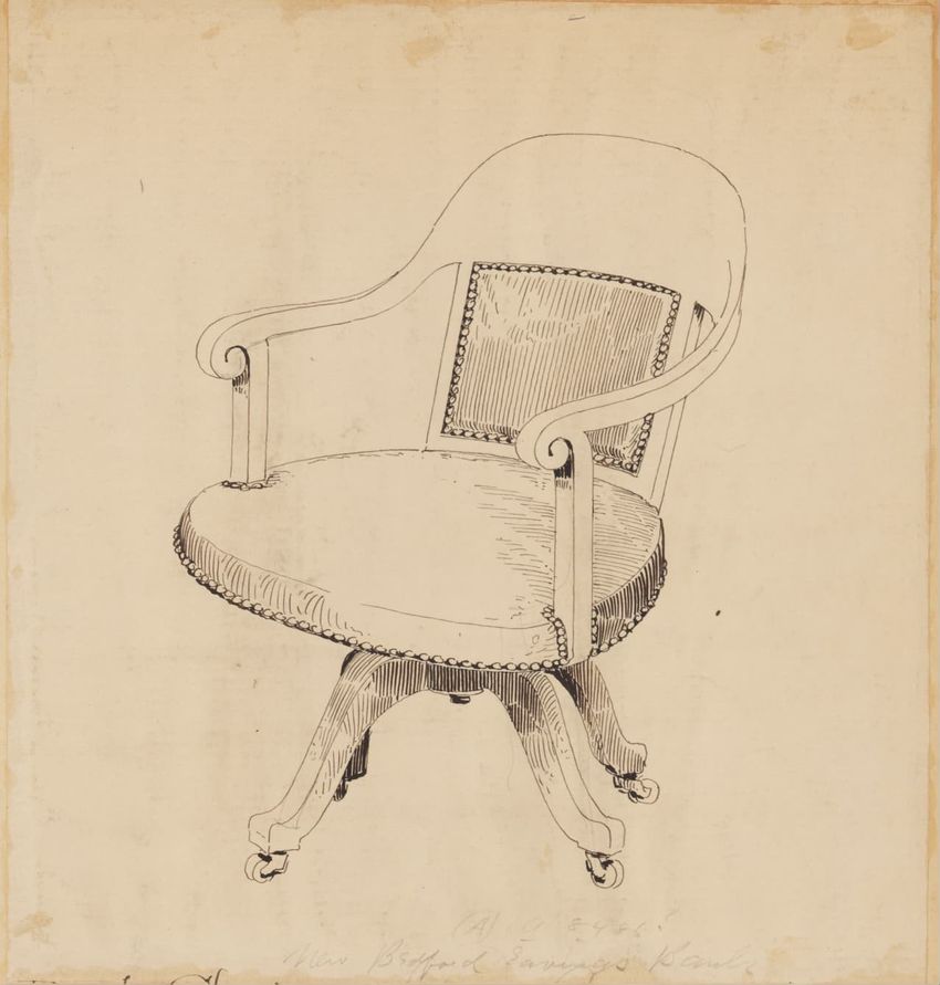 Untitled design drawing rendered in pencil on trace. Perspective view is shown. Swivel arm chair has curved back; molded rounded crest rail and continuous shaped arms with carved scrolled handholds; shaped curved arm supports with foliate carving at base; upholstered back, sides, arm pads, and seat ...