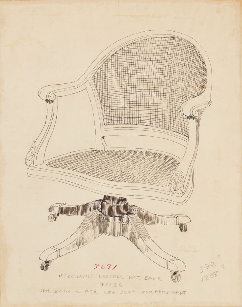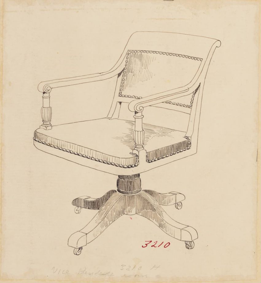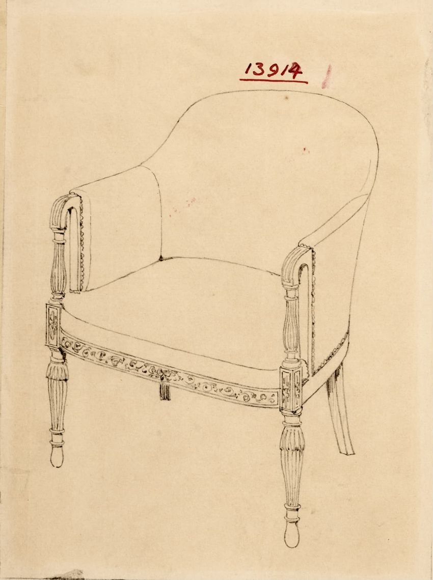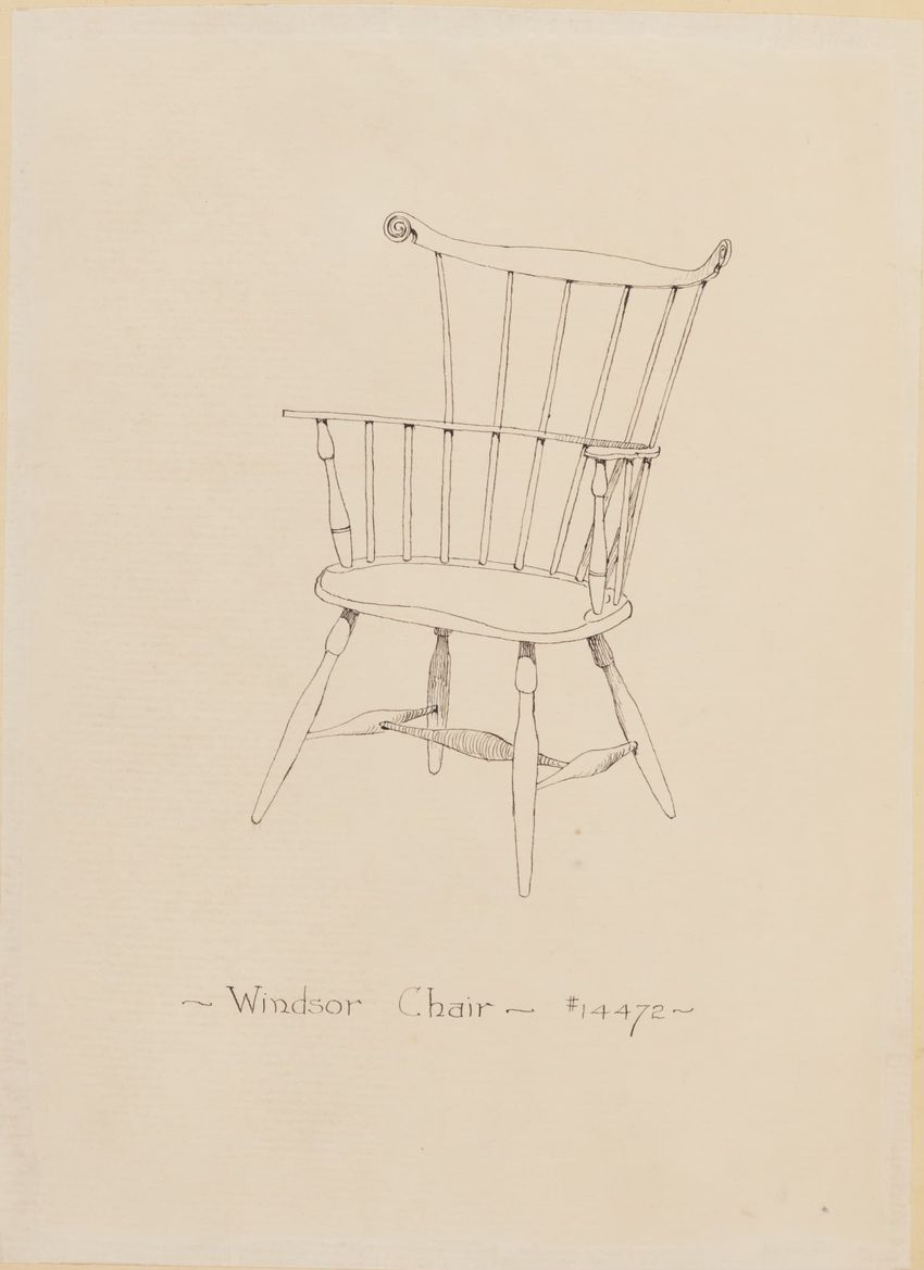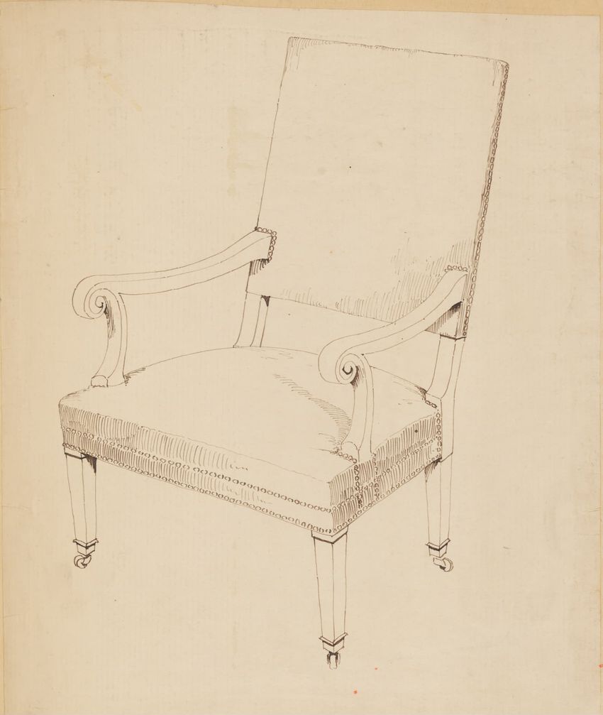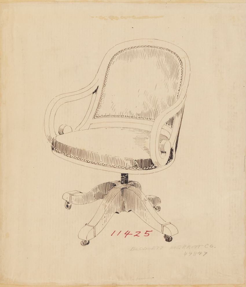 Untitled design drawing rendered in pencil on trace. Perspective view is shown. Swivel arm chair has curved back; molded rounded crest rail and continuous shaped arms with carved scrolled handholds; shaped curved arm supports with foliate carving at base; upholstered back, sides, arm pads, and seat ...