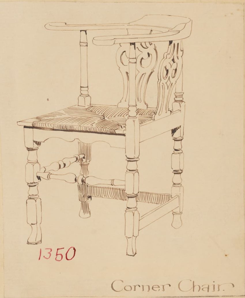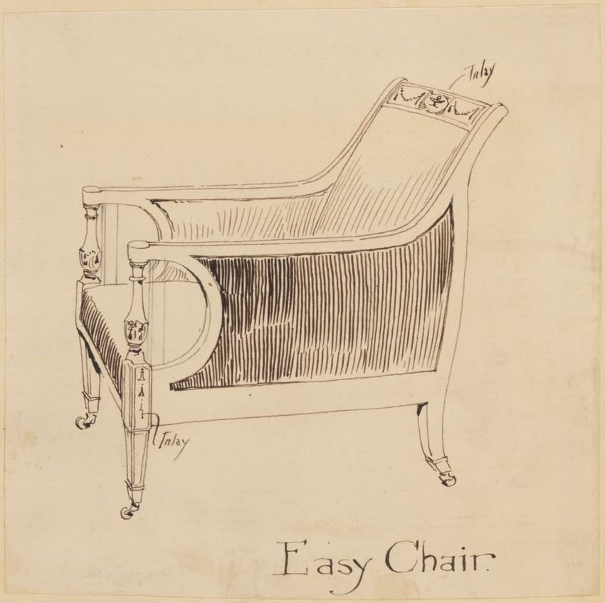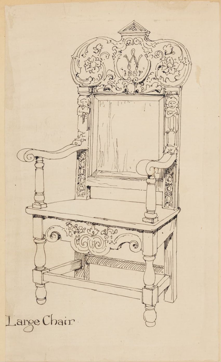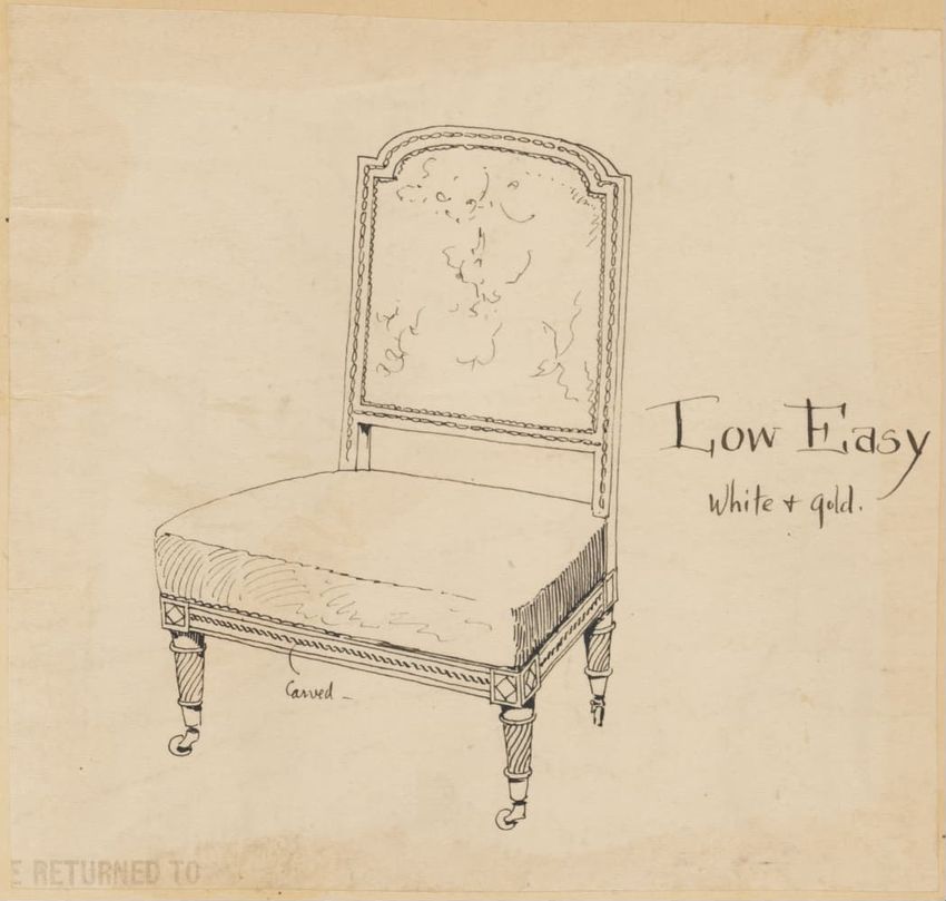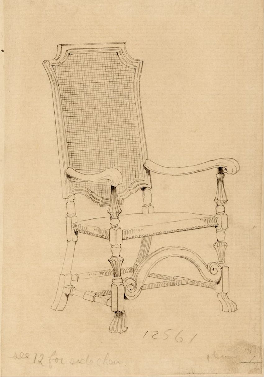 Untitled design drawing rendered in pencil on trace. Perspective view is shown. Swivel arm chair has curved back; molded rounded crest rail and continuous shaped arms with carved scrolled handholds; shaped curved arm supports with foliate carving at base; upholstered back, sides, arm pads, and seat ...