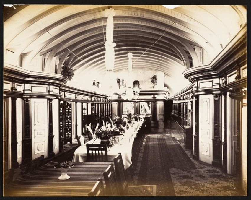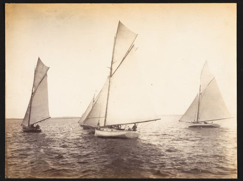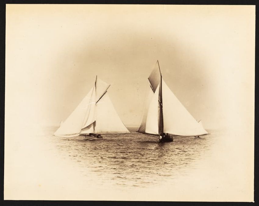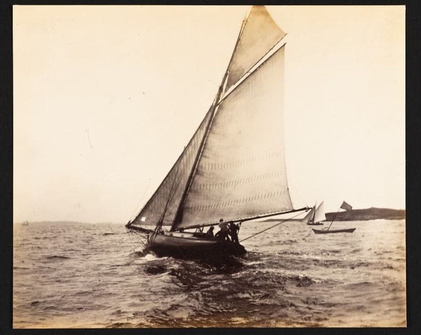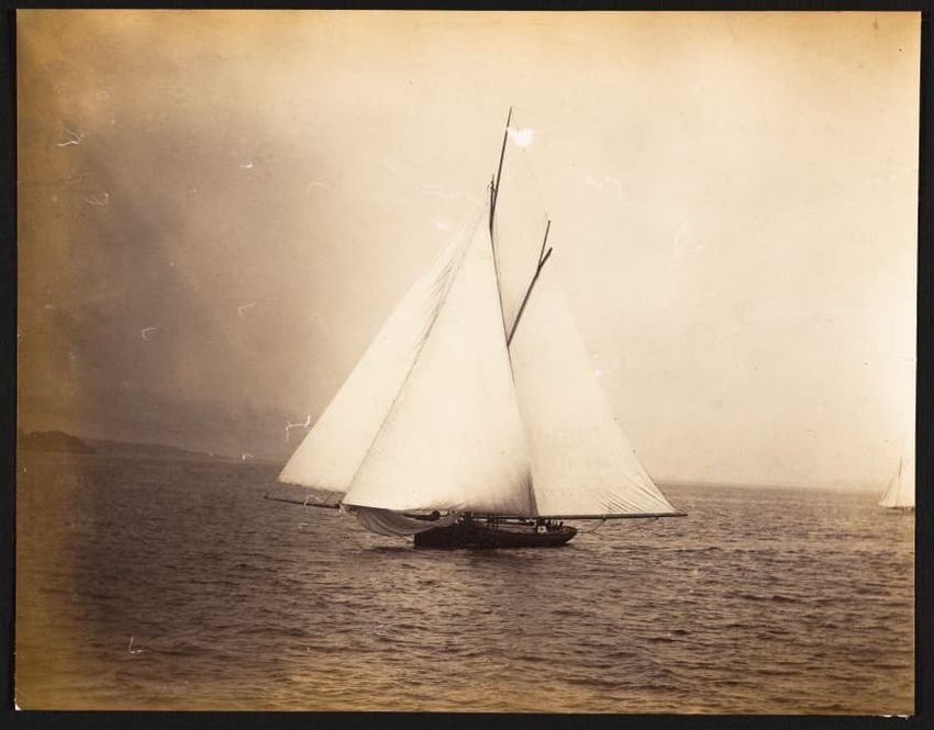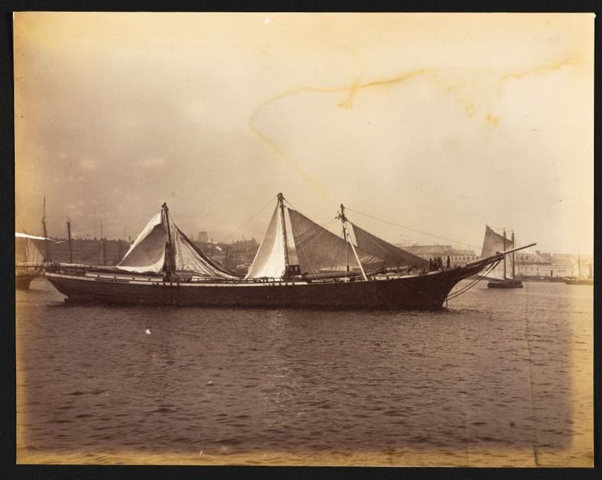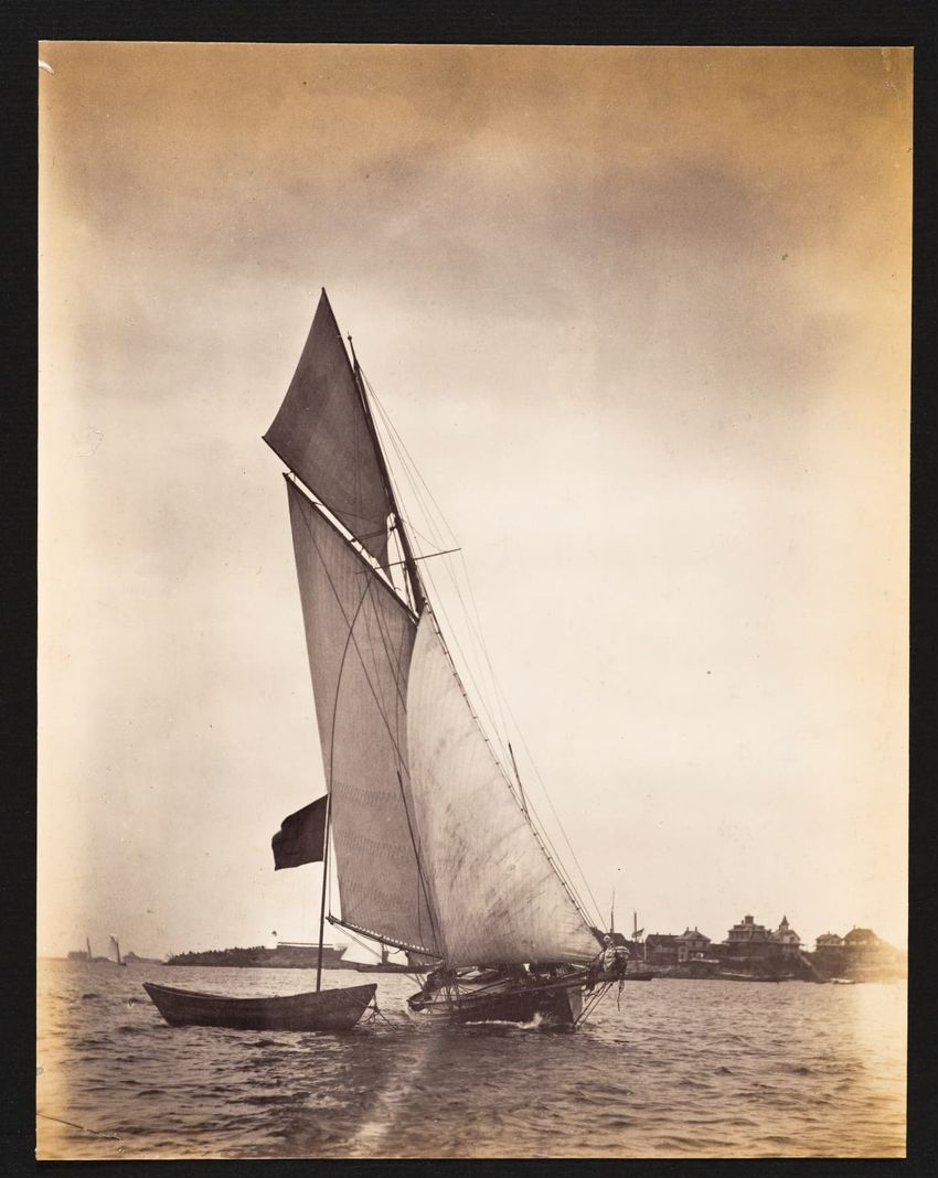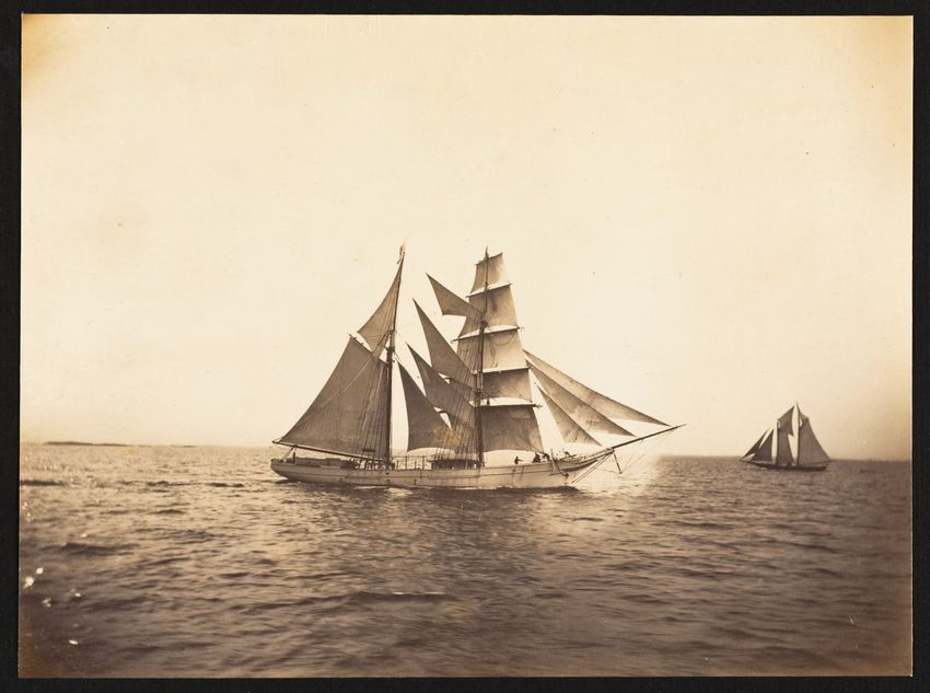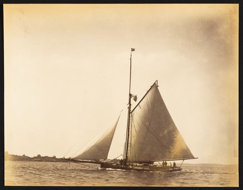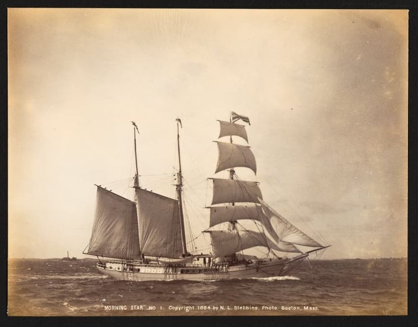 "The Haroldine, of Providence, R.I., was a notable early four-master, launched at North Weymouth in 1884. Symbolic of the shift from deep-water sail to coasting, she had originally been intended for a square-rigger --- note the indicatively high bulwarks. She is rigged with one yard, from which a sq...