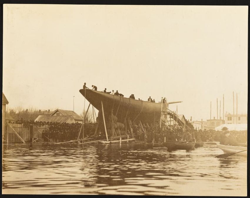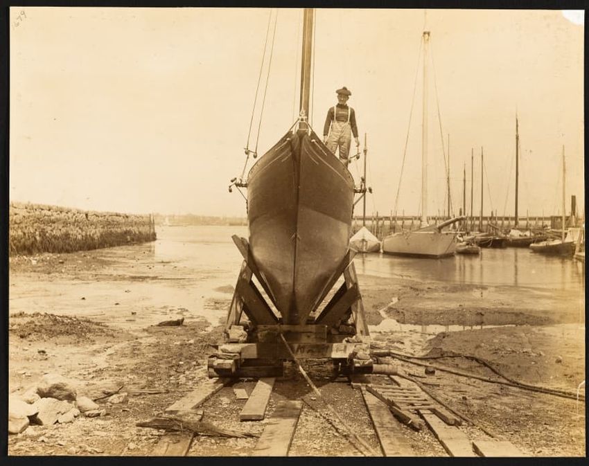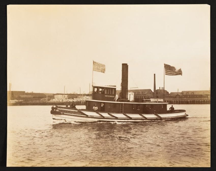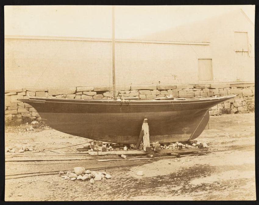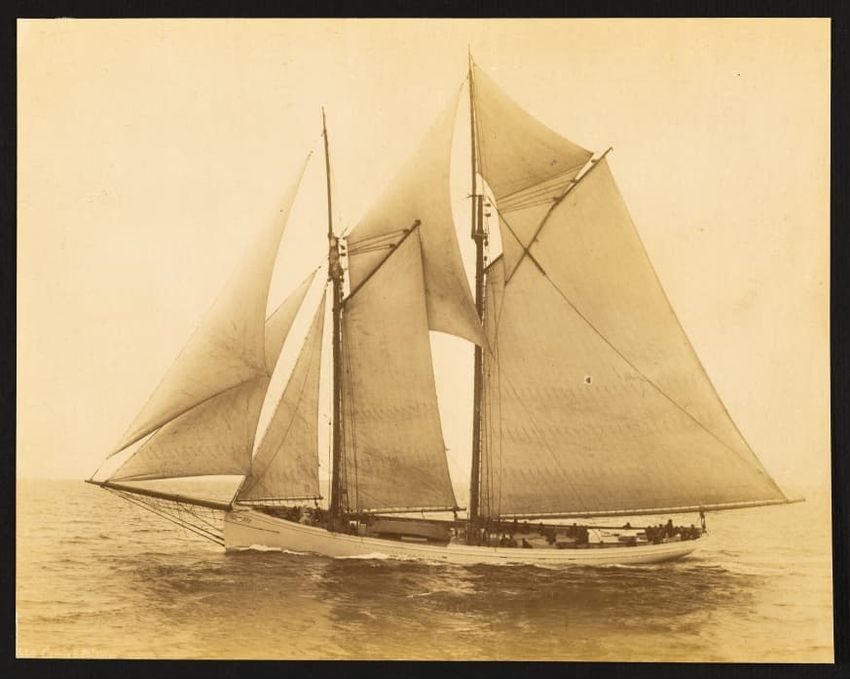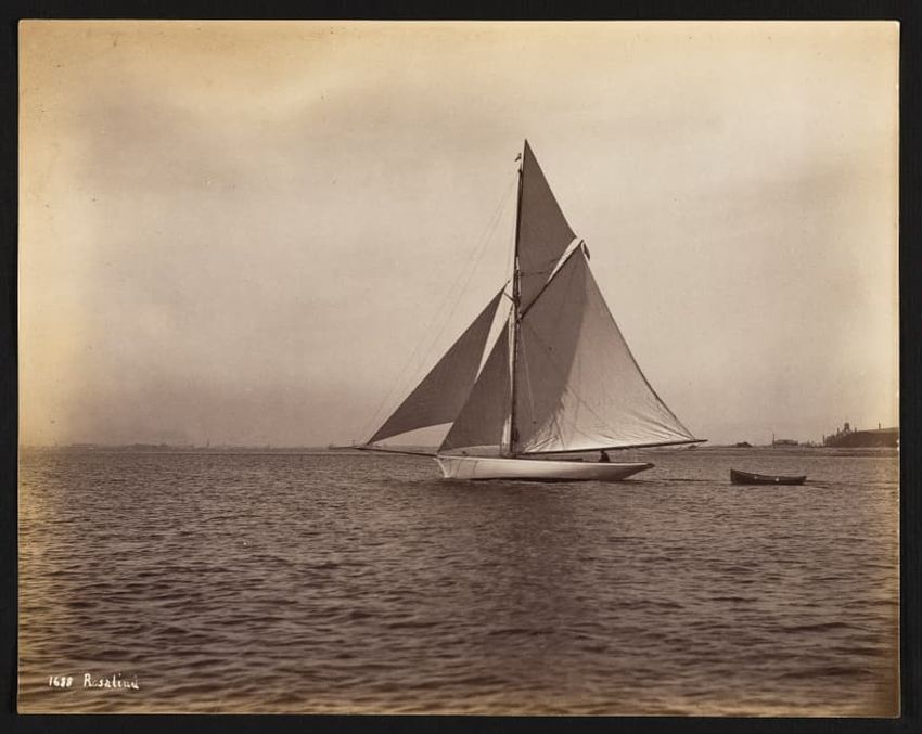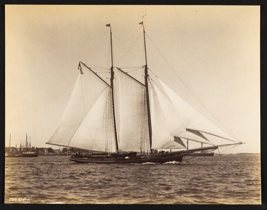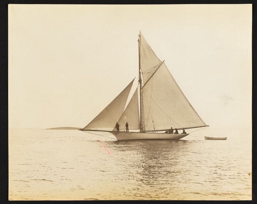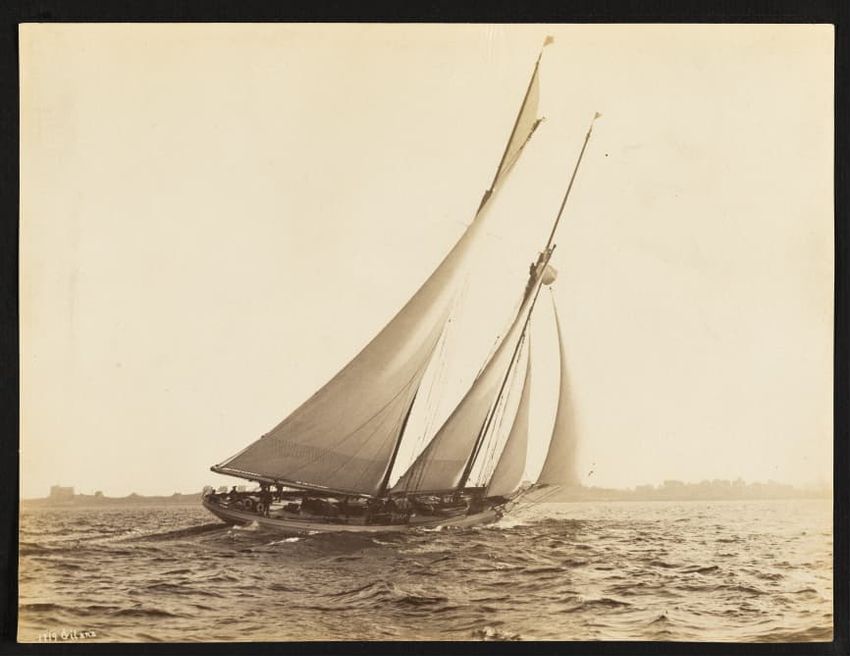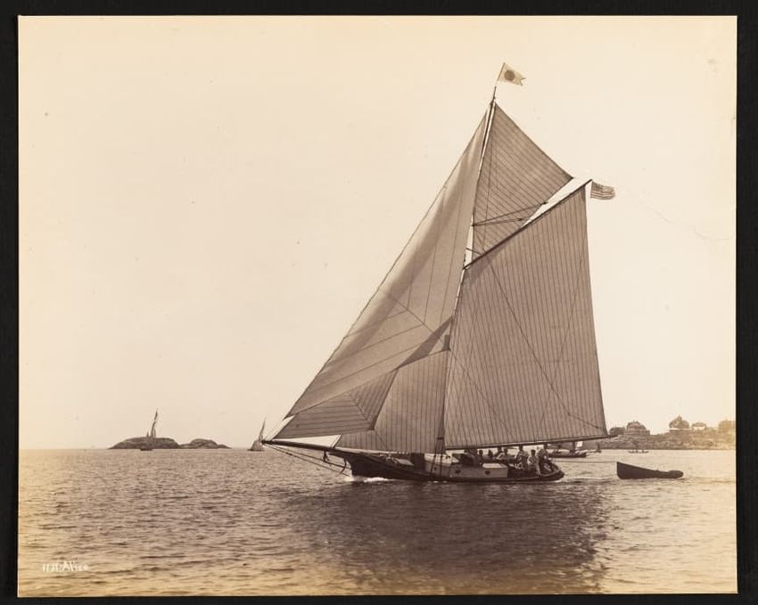 See also: Henry Peabody R.A.Y. #4. This photo shows the Puritan leading a large fleet of yachts, possibly during a New York Yacht Club Cruise or during a Goelet Cup race. But on October 9, 1887 there was no large regatta in which Puritan competed!