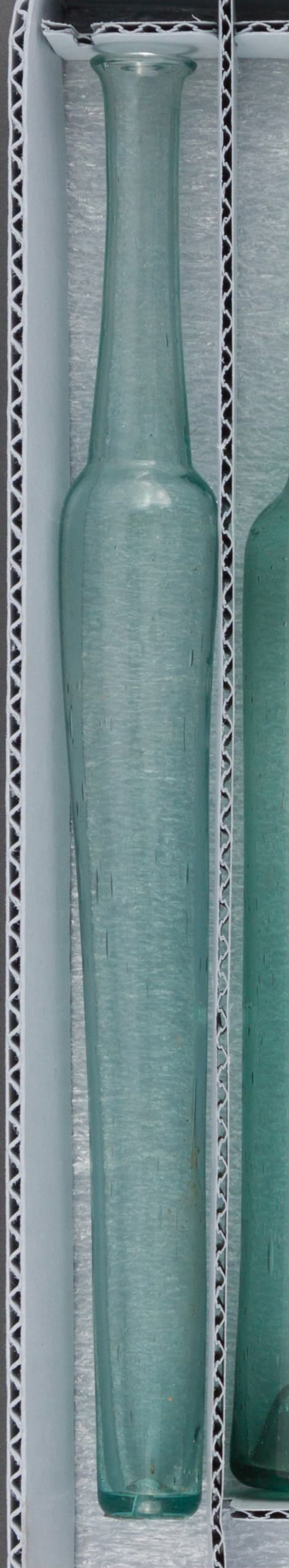 Green glass tube with neck. "Germany" sticker affixed to body near base.