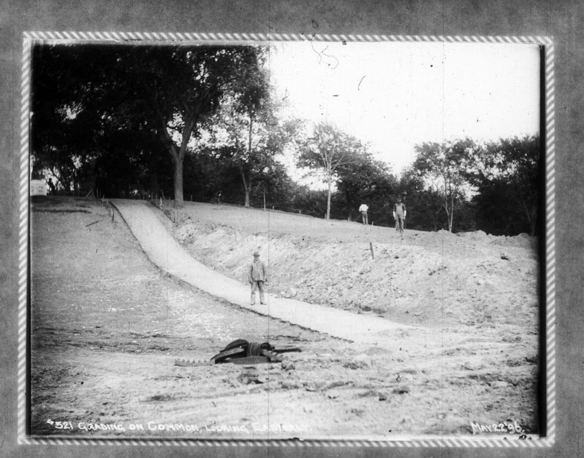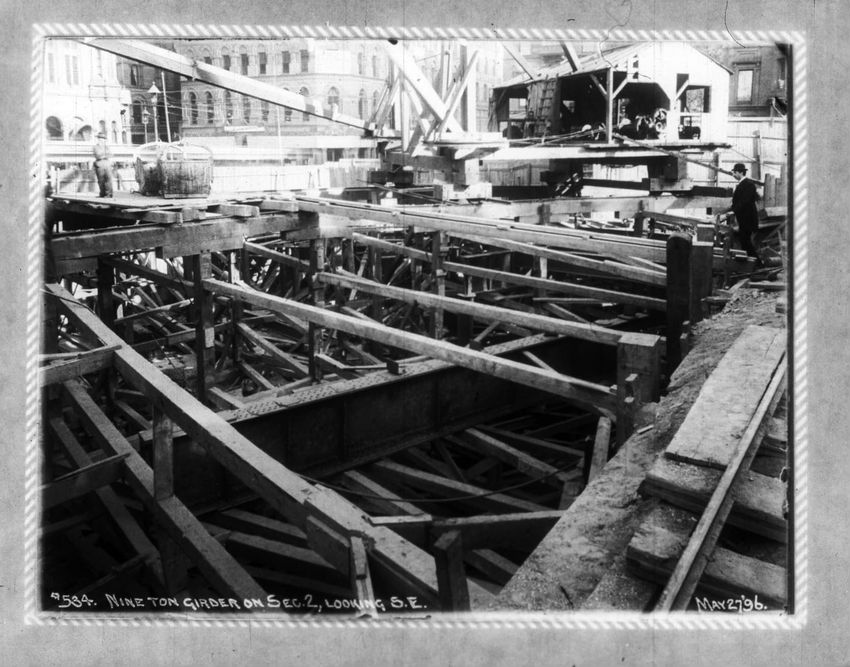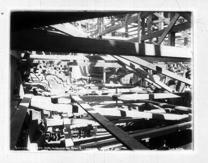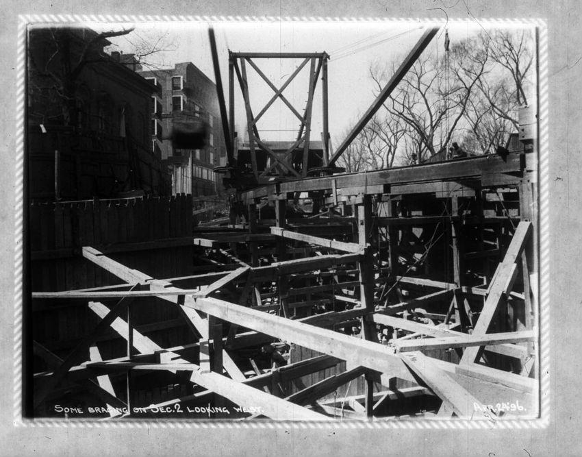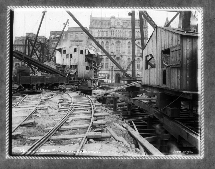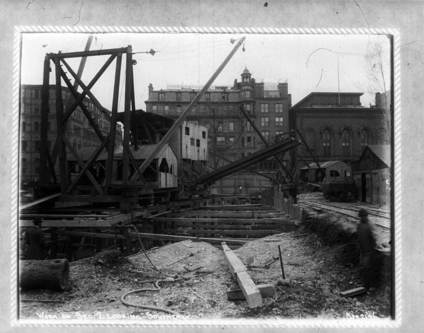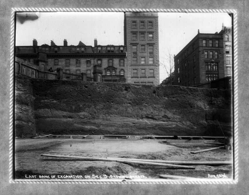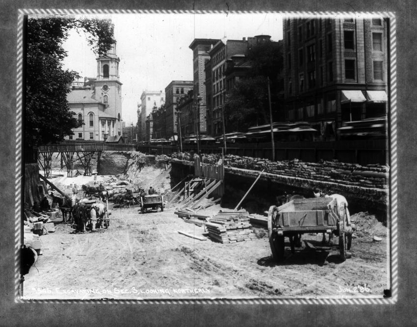 Several men stand in the bottom of the future subway with one man looking over the fence above. Park Street Church is in the background.