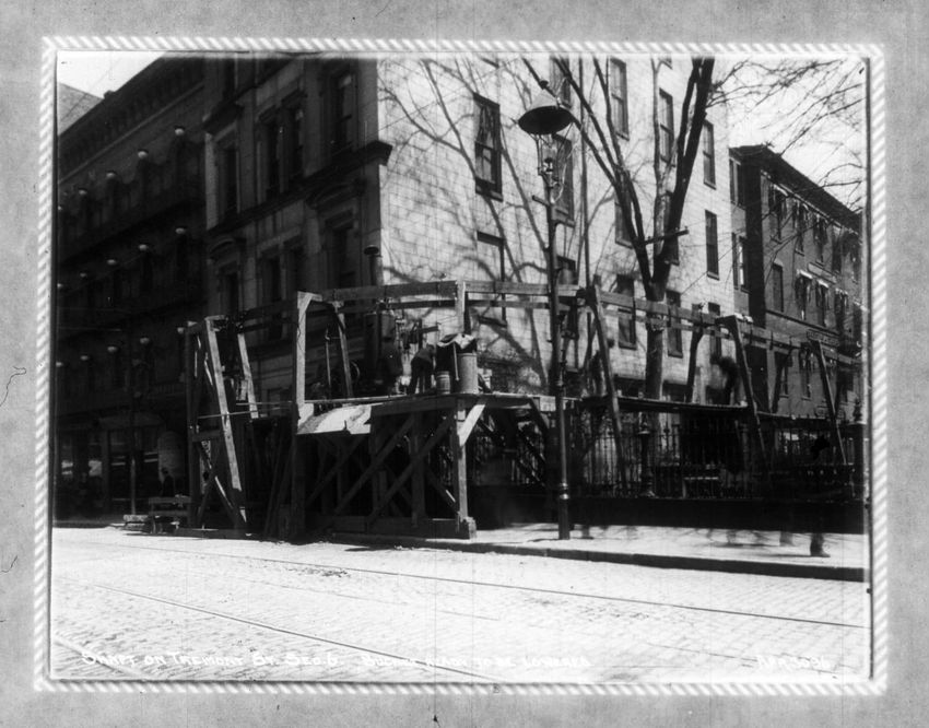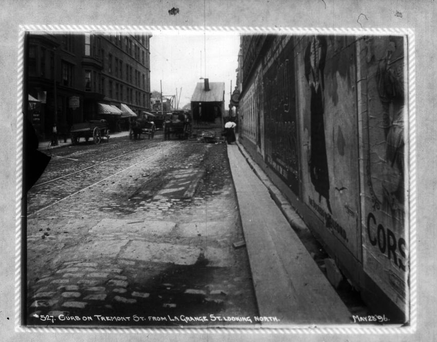 A scaffolding platform can be seen on the fence at the King's Chapel Burying Ground. The Boston Museum is just down the street on the right side of the image. Advertising signs can be seen in Scollay Square.