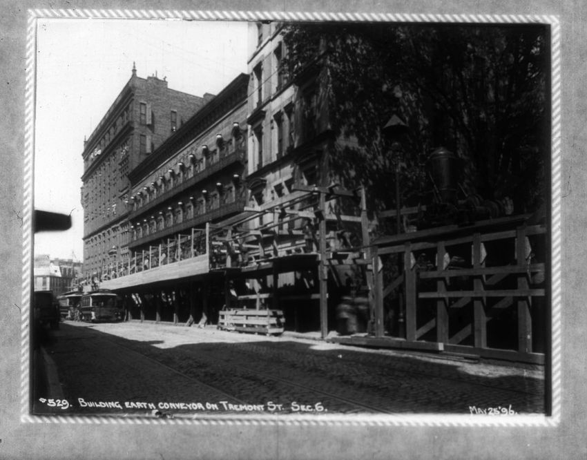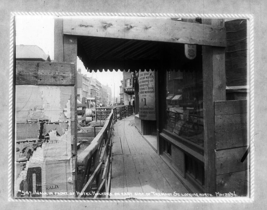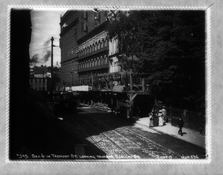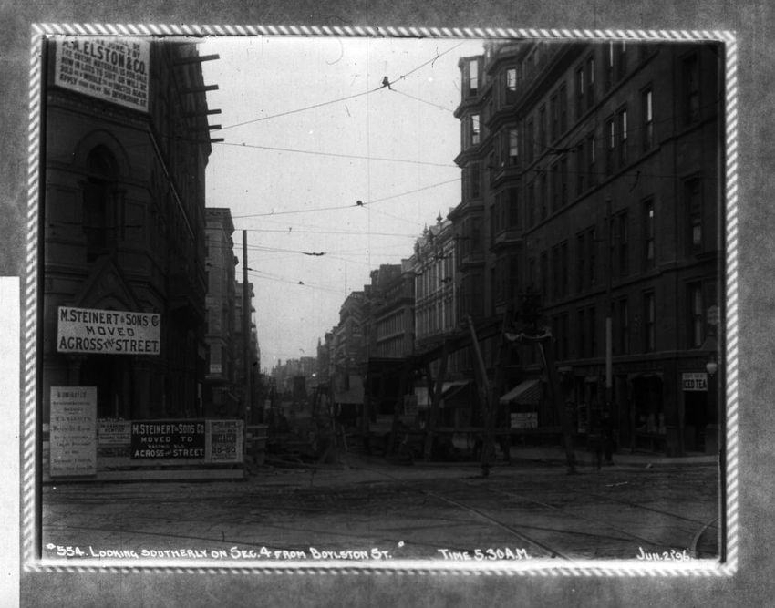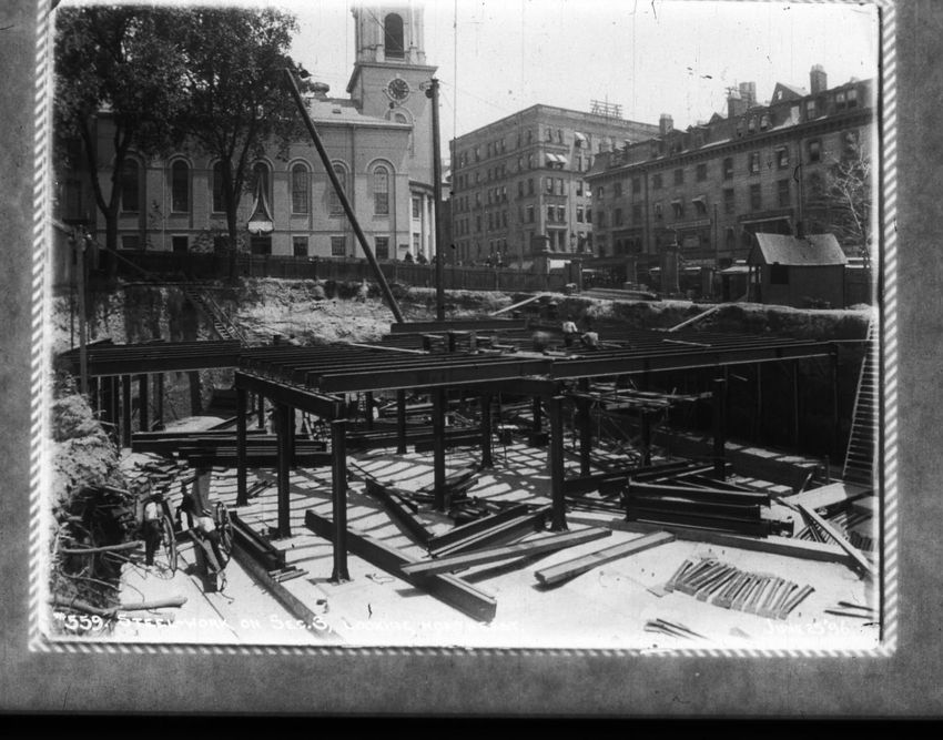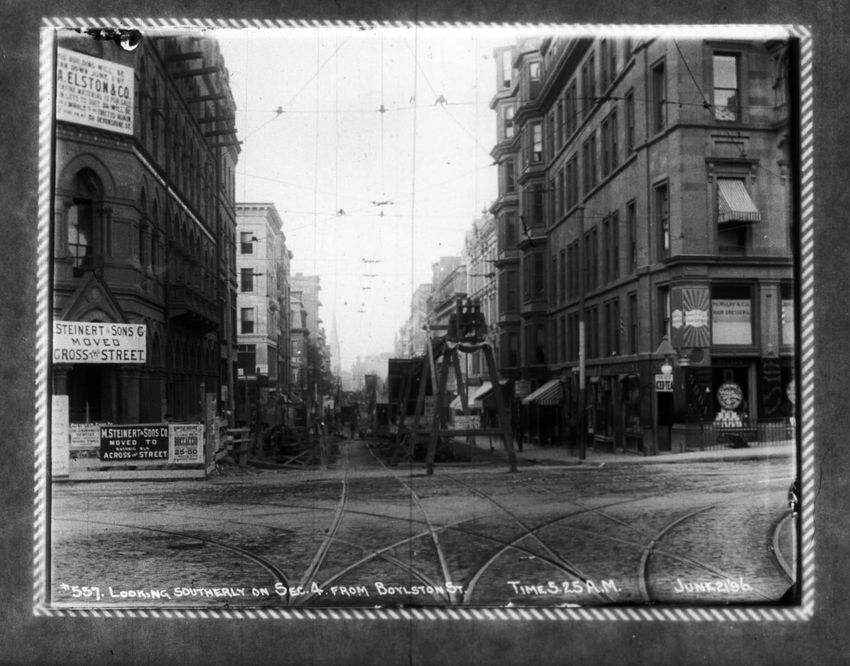 A construction site can be seen on the right side of the image. The Pelham Hotel building is on the left at the intersection with Boylston Street. The Touraine Hotel is on the right at the Boylston intersection.
