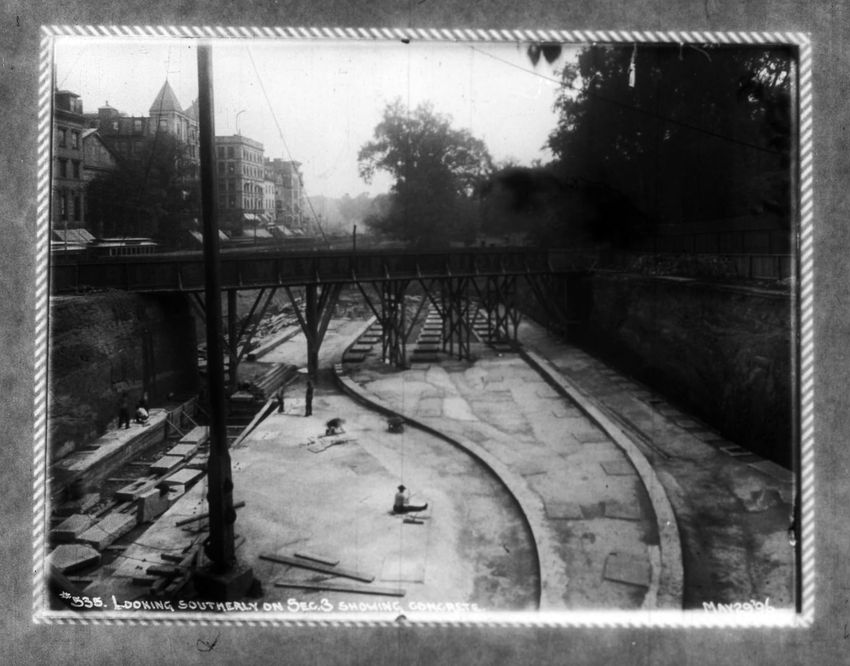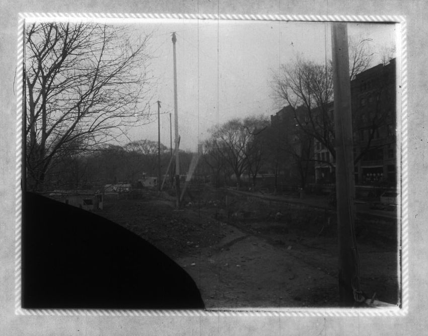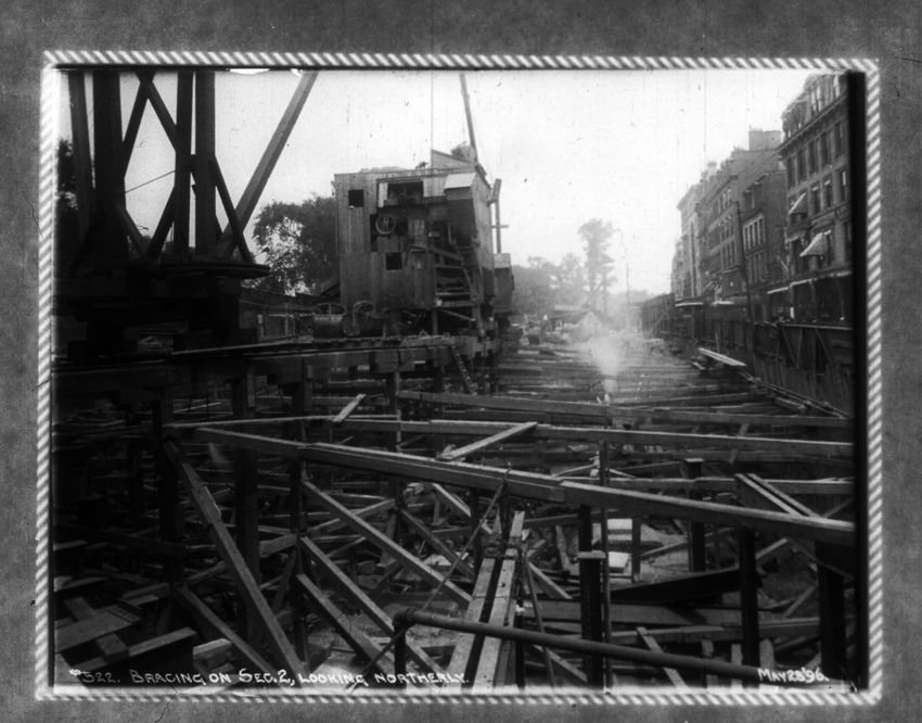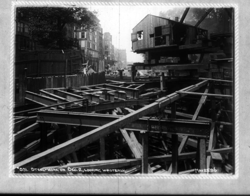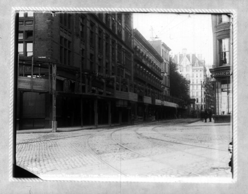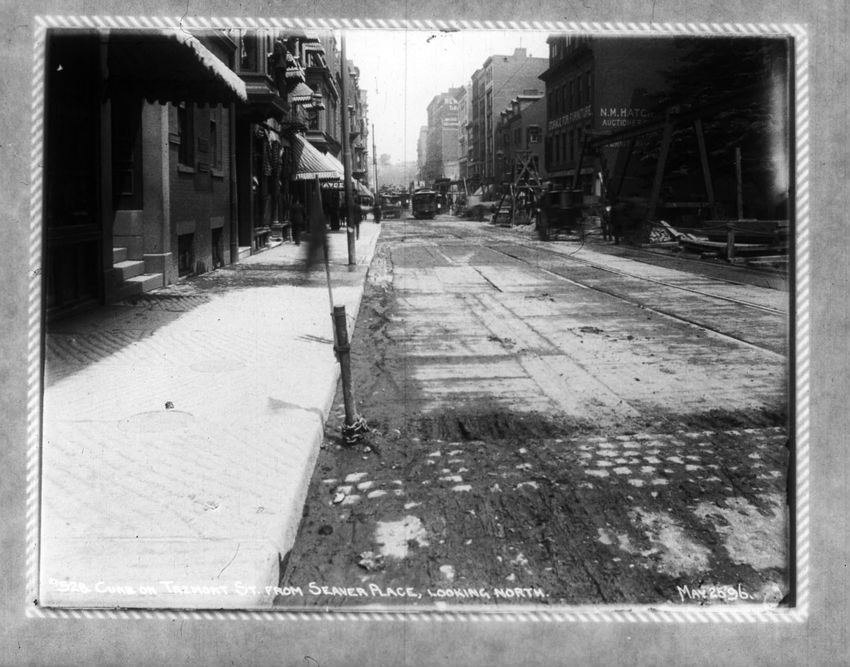 A construction site can be seen on the right side of the image. The Pelham Hotel building is on the left at the intersection with Boylston Street. The Touraine Hotel is on the right at the Boylston intersection.