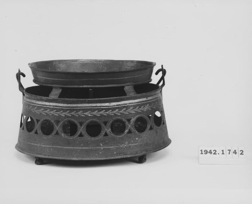 Oval toleware teakettle warmer with pierced sides and canted lip. Red and gold decoration with guilloche and foliage border motif.