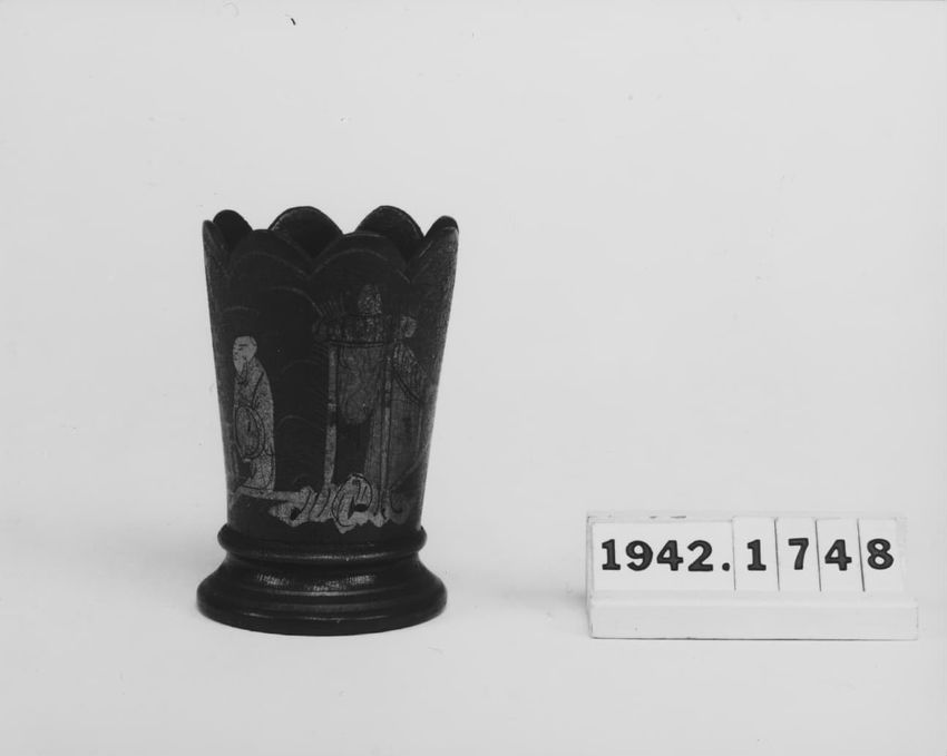 Red, gold, and black cup with a circular stepped foot, flared sides, a scaloped. rim, and chinoiserie decoration.