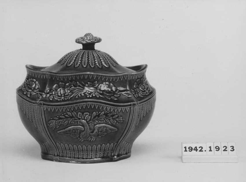 Emerald green, oval sugar bowl with curved sides and panels; decorated with eagle with acanthus and floral motif.