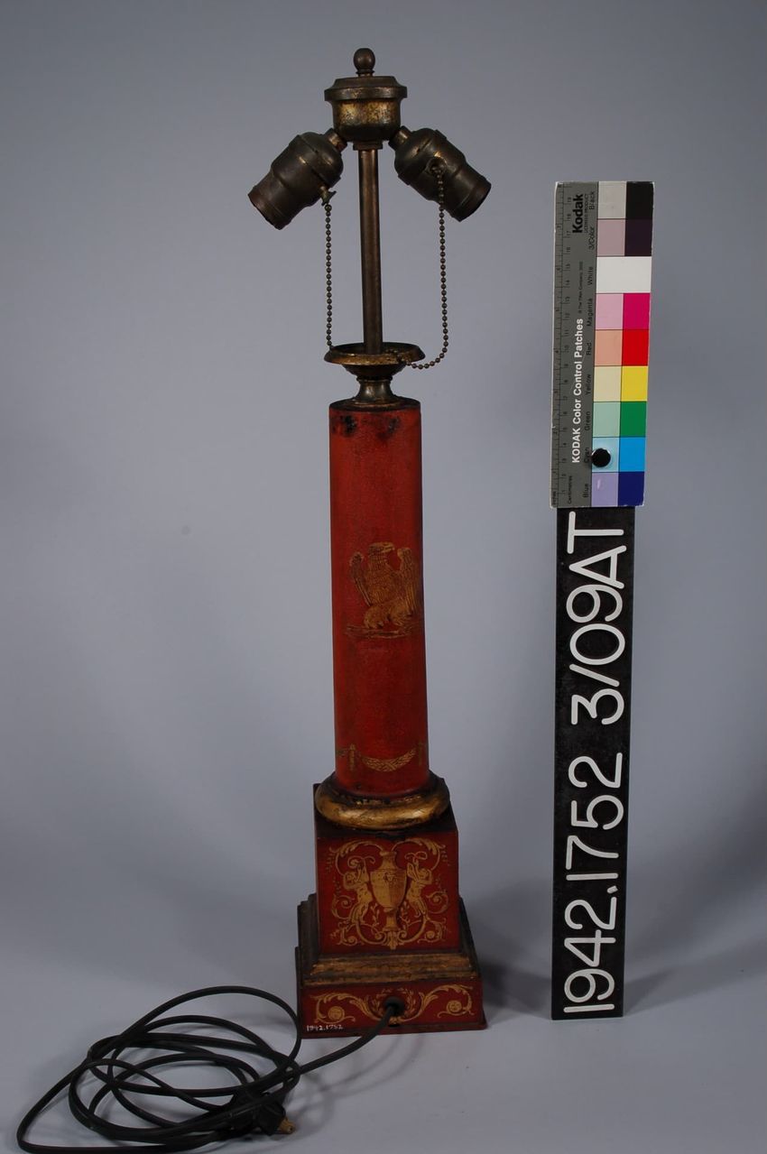 Tin lamp painted red with gold decoration; square pedestal base; columnar shaft; eagle and carytds