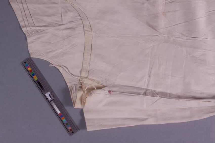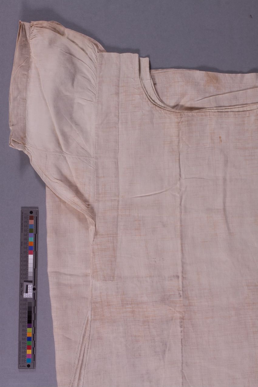 White linen; plain; drawstring neckline; short sleeves gathered at shoulder; mended front opening; drawstring at sleeve.