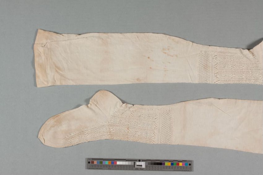 Cream silk stockings with a lacy pattern from ankle down. Stamped near top in blue ink is a laurel wreath and crown.