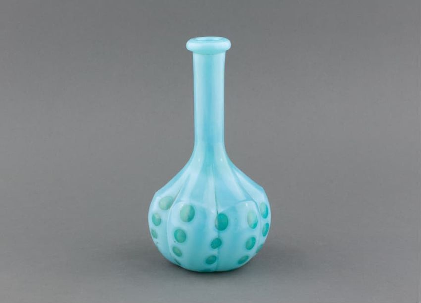Earthenware plate with purple transfer-printed vignette of pagoda, vase with flowers and exotic bird. Hand-painted overglaze in blue, yellow, red and green is applied to flowers and leaves. Border pattern of scrolls and sprigs.