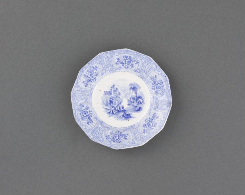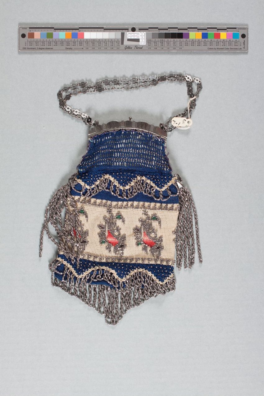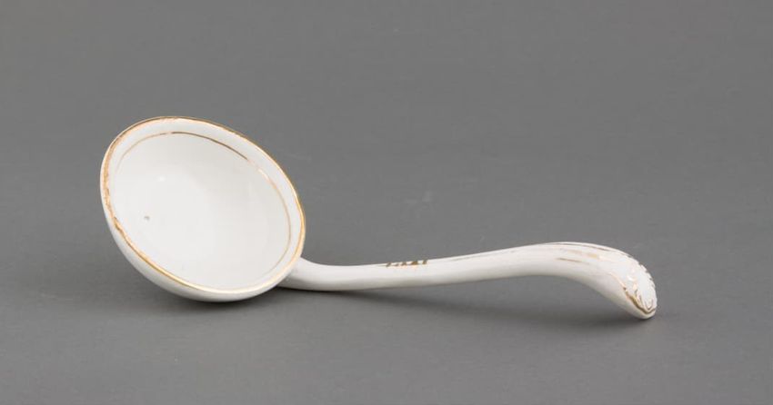 Tall, red glass vase with circular foot, heavy bulbous body that tapers to neck and flares to lip. Five frosted glass bands with two painted white floral bands and remnants of gilt bands at rim, bracketing the frosted glass bands, and Greek key pattern around shoulder decorate the vase.