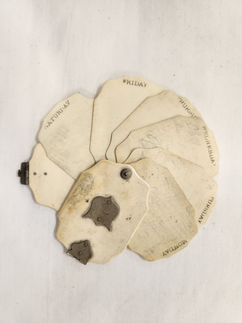 FAN (A): Gold lacquered wooden sticks and guards, pierced with openwork design; white satin leaf sewn with gold sequins; reverse of beige satin; carved metal ring with white silk cord and tassel. BOX (B): Cardboard, hinged, covered in white paper with gold geometric stripe.