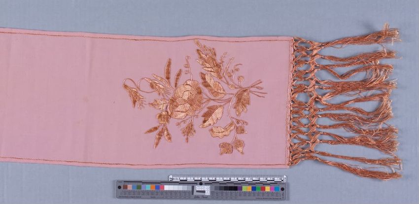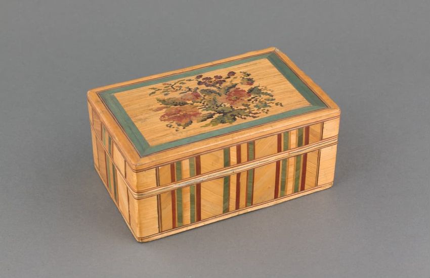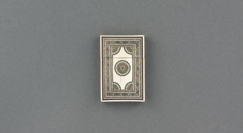 carving (processes), ivory (tooth component), moiré, painting (coating), silk (textile), silver (metal)