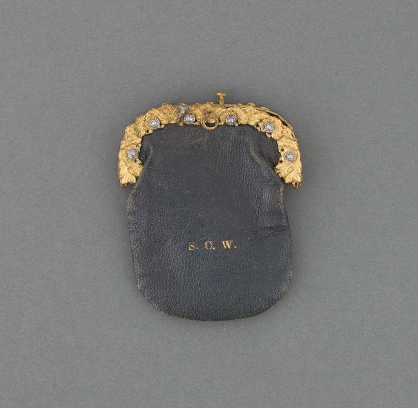 This fan is constructed from an ivory-colored silk moiré leaf decorated with painted floral sprays in pastel colors on recto, single gilt floral spray on verso. Carved ivory sticks and guards set with silver and mirrors, mother-of-pearl washer, with brass ring and ivory-colored silk cord and tassel.