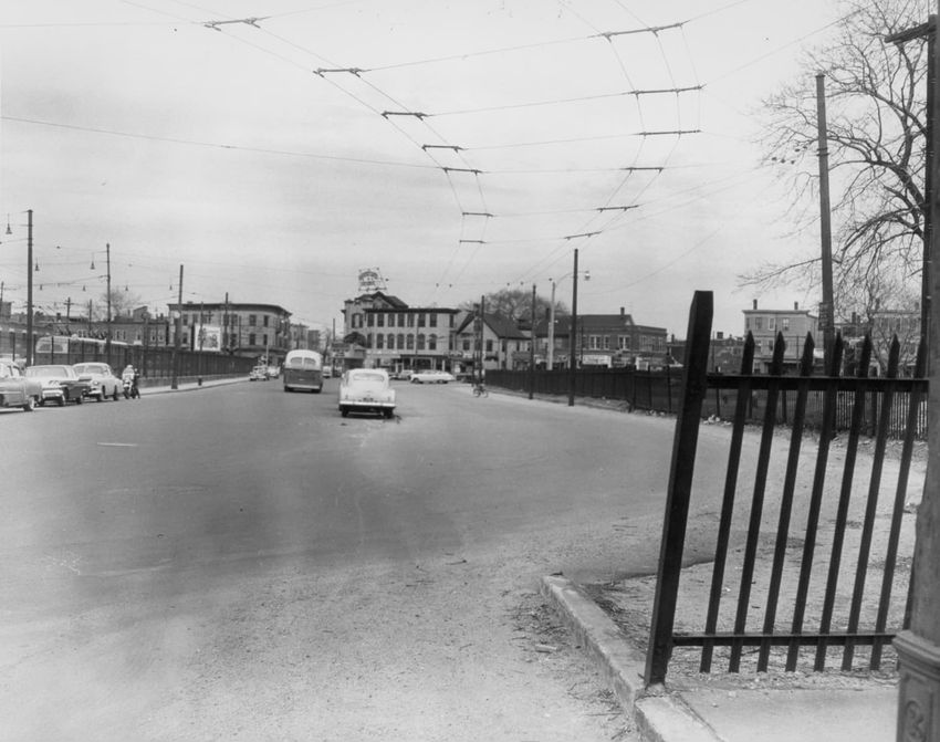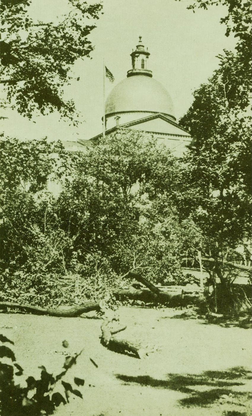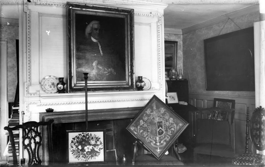 An interior view of the underside of the roof of the Old Ship Meeting House in Hingham, Massachusetts, the only surviving 17th century meeting house in the United States. The elements of the hip roof structure are visible, such as the curved struts, king post, rafters, and purlins. A set of stairs l...
