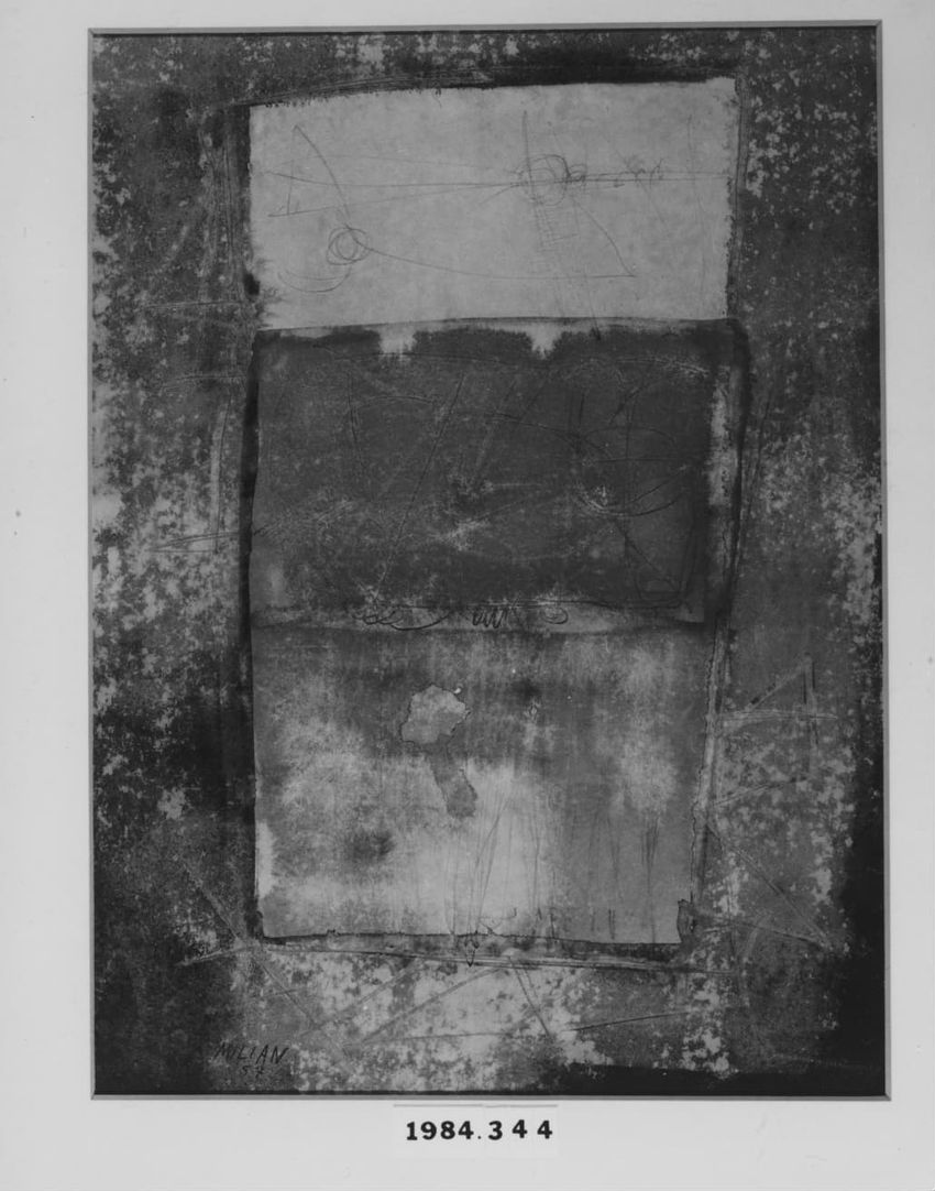 Fork has two slender, sharp tines with thick heel, tapered shaft all of steel, mounted on mid-section is silver repousse band with ribbon-tied laurel festoons flanked by beading handle. Carved, rough, horn; silver end tip.