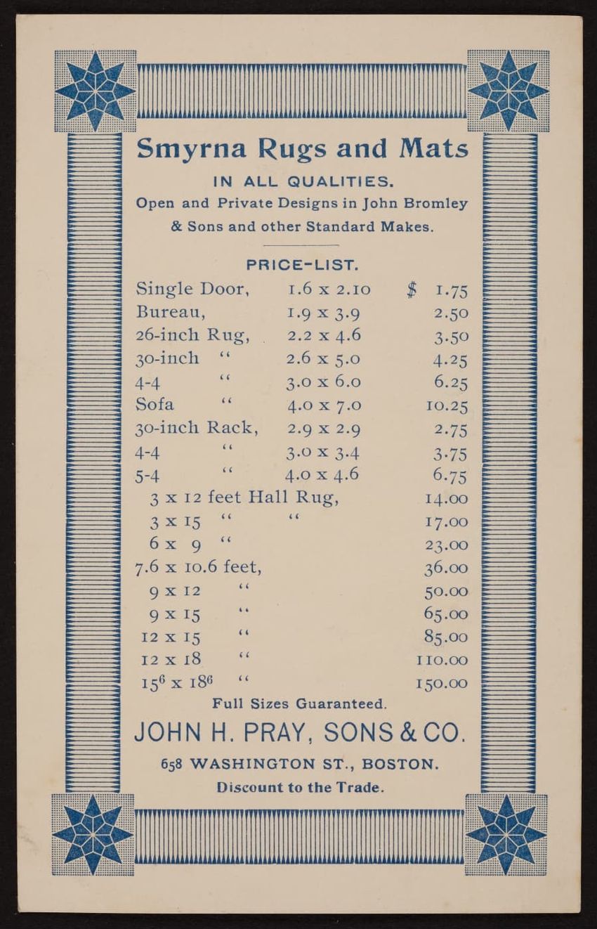 Pray is an importer, jobber, retailer and manufacturers agent for carpetings, mattings, oil cloth, oriental rugs, carpets and upholstery.