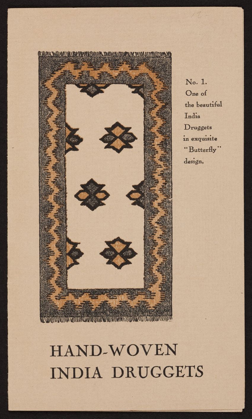 Supplies and patterns for persons creating hooked rugs are described. Background on Edward Sands Frost, who inspired The Old New England Hooked Rug Studio, is provided on the inside of the brochure.