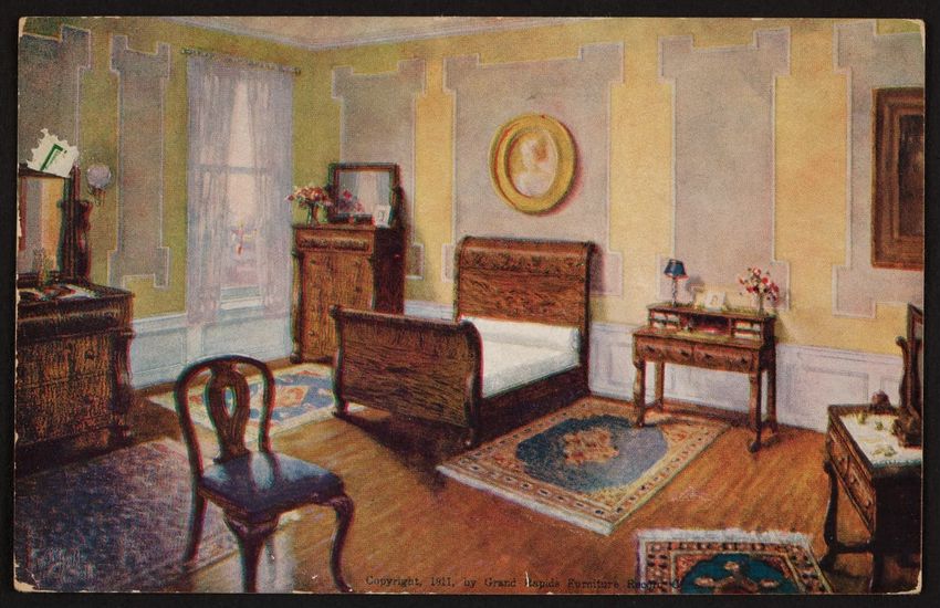 The card verso describes the chamber suite shown in the image with an August 1912 calendar.