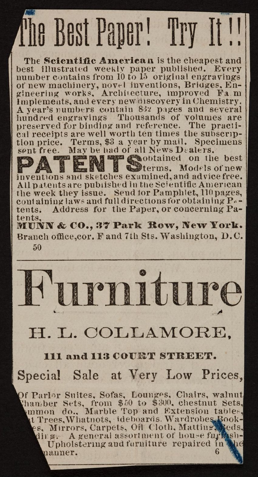 The Metal Corners were patented February 10, 1880. The product is carried by Clark Chase, furniture, crockery, corners and binding for oil cloth in Bellows Falls, Vermont.