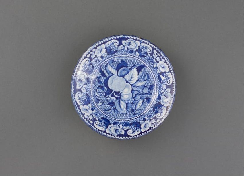 A blue transfer print pearlware plate. The central design depicts The Wayside Inn in Sudbury, MA, which is bordered by a floral motif.