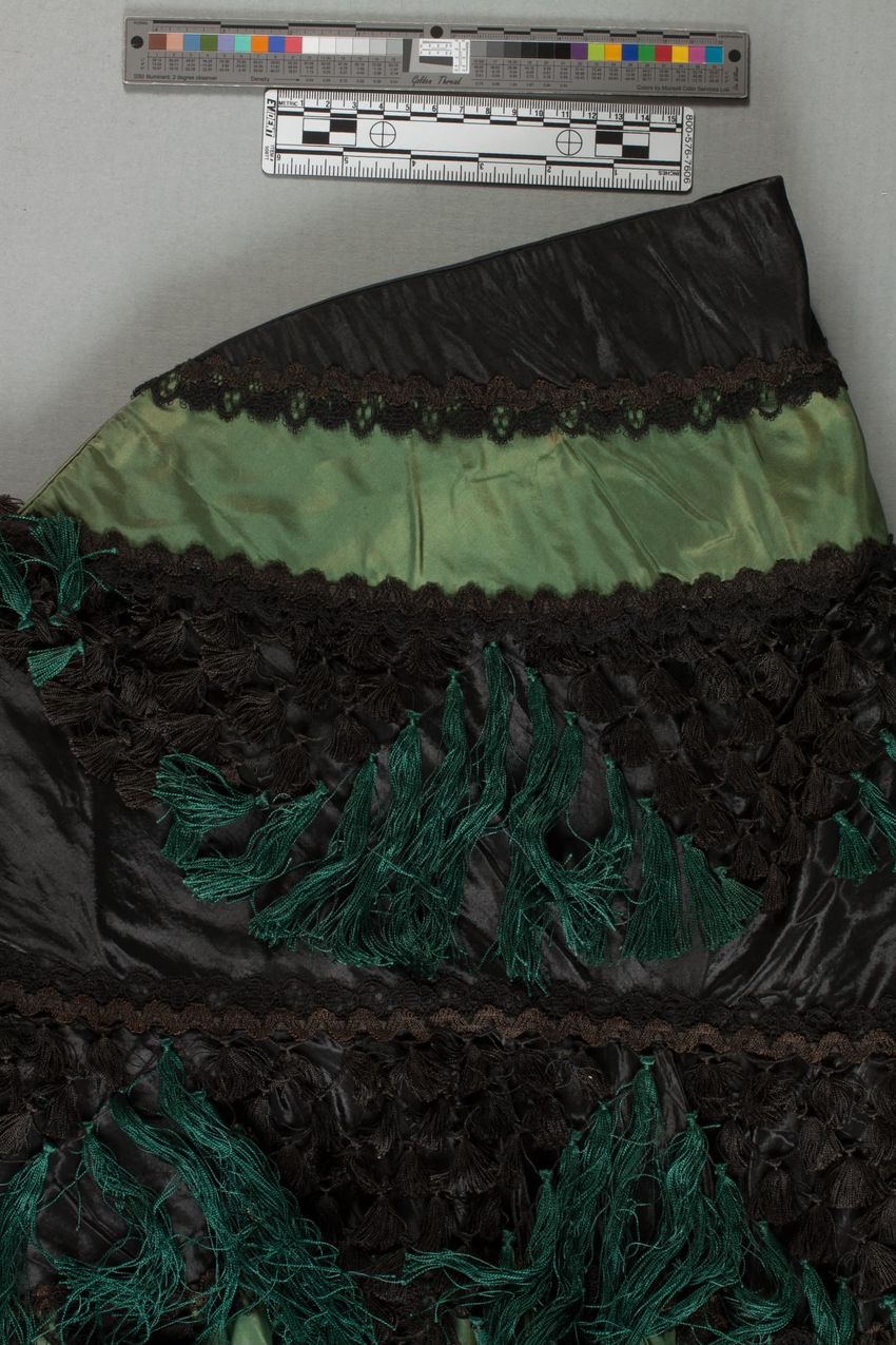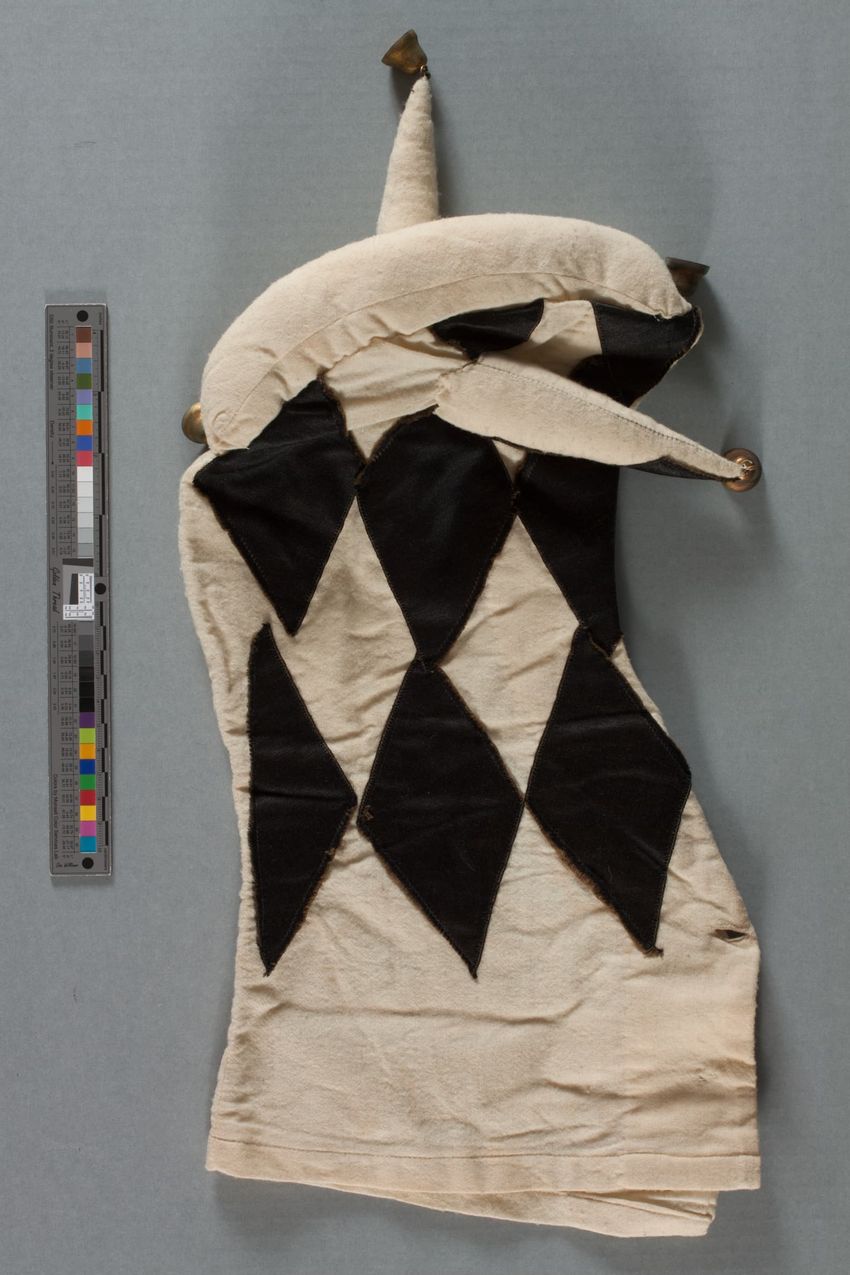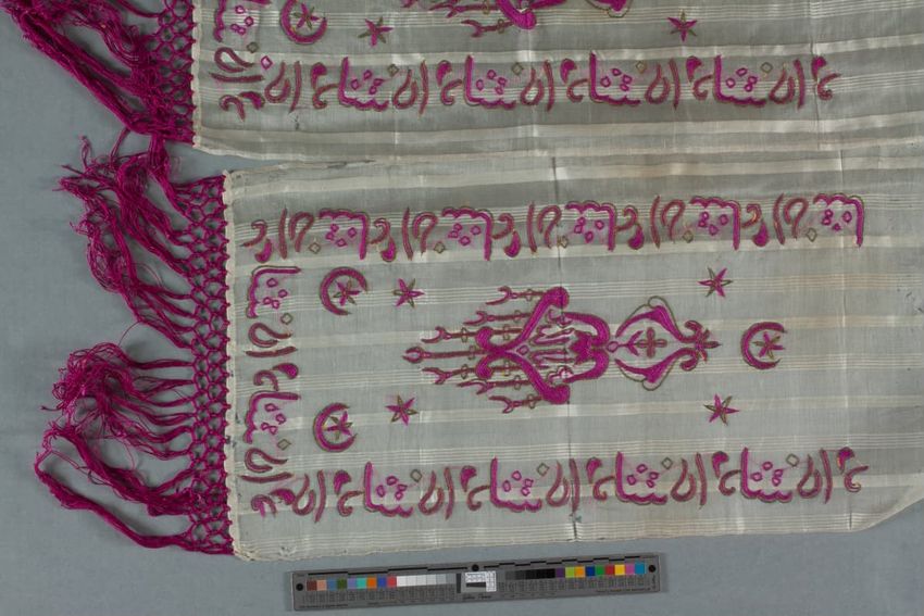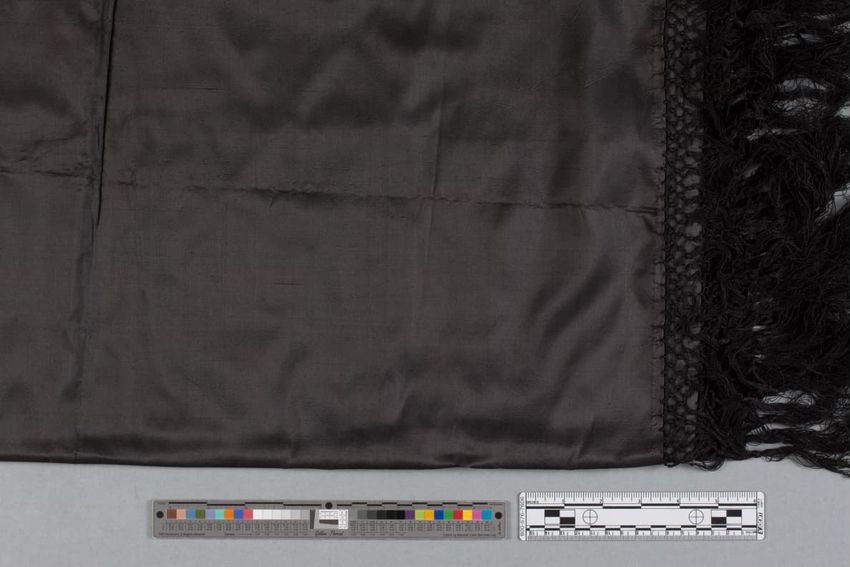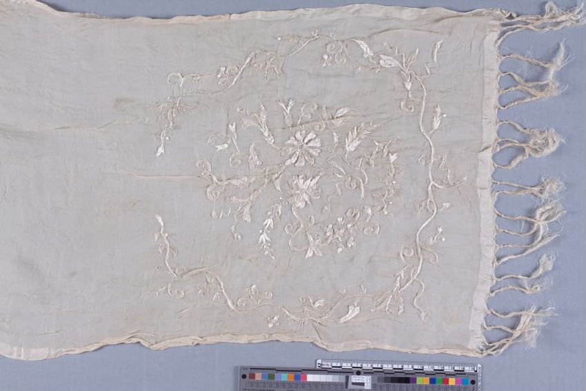 Red cotton; square shape; bouquets of wildflowers in each corner, with border of shields in various shapes, sizes and colors, representing towns/cities in Switzerland; in blues, yellow, green, orange; narrow border of stripes in white, black, and orange.